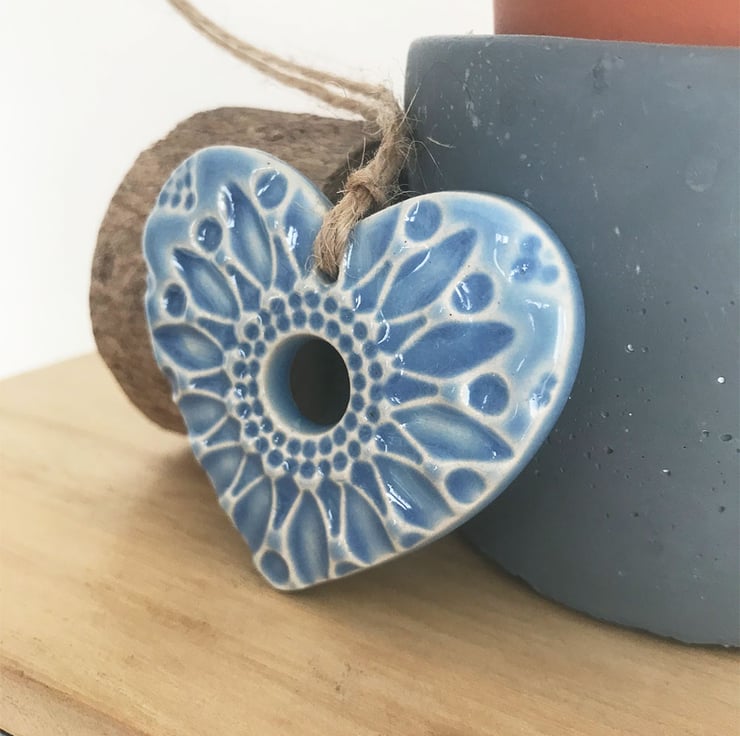 Small Ceramic heart hanging decoration Pottery Heart Folk art  Blue
