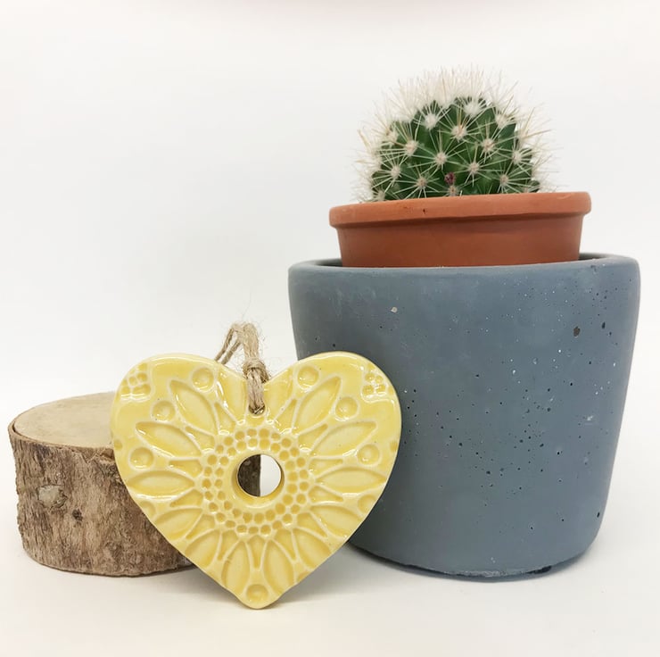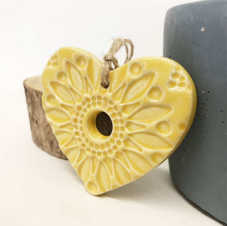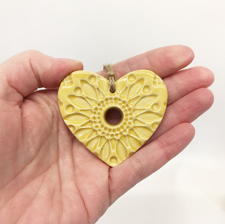 This little heart is made from white earthenware clay, imprinted with pattern and finished with a bright, glossy glaze. It has been fired twice, once to the bisque stage and then a second firing for the glaze. It measures 6 centimetres wide x 5.5cm height x 5mm thick. It can be hung outside.
