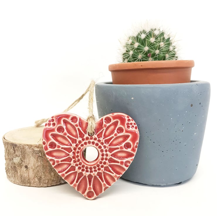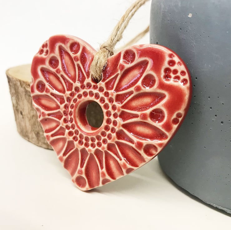 Small Ceramic heart hanging decoration Pottery Heart Folk art Red