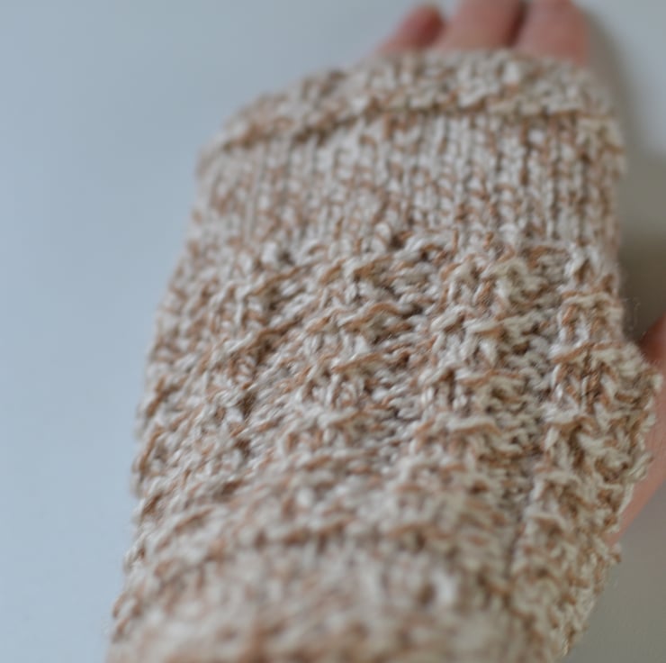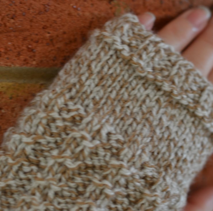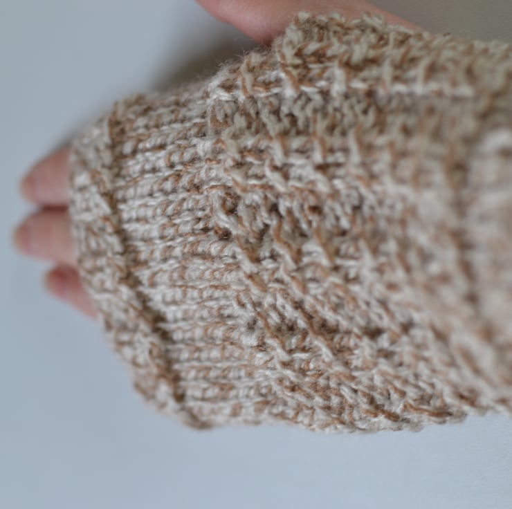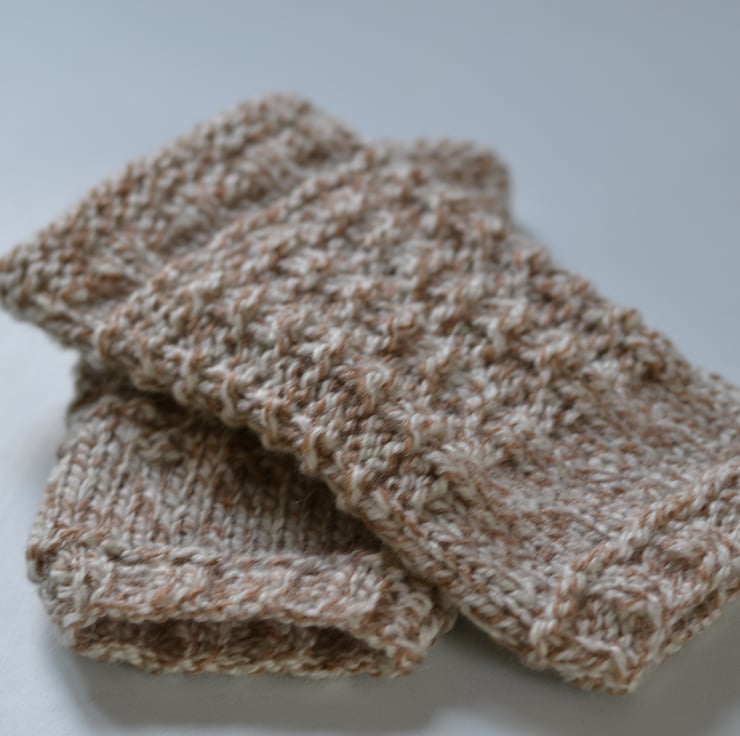 Aran knitted fingerless gloves in a lovely marl yarn in oatmeal and mink 25% wool fibres.