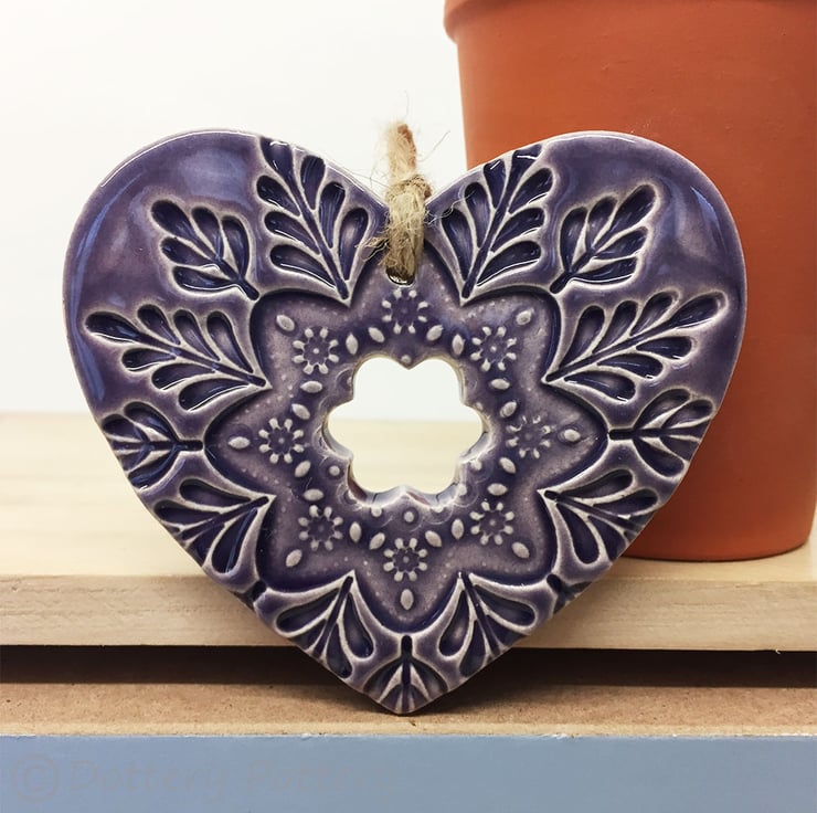 This listing is for a ceramic heart decoration. It is made from white earthenware clay, imprinted with pattern and finished with a bright, glossy glaze. It has been fired twice, once to the bisque stage and then a second firing for the glaze. It measures 7.5 centimetres wide and the same in height x 5mm thick. It can be hung outside.