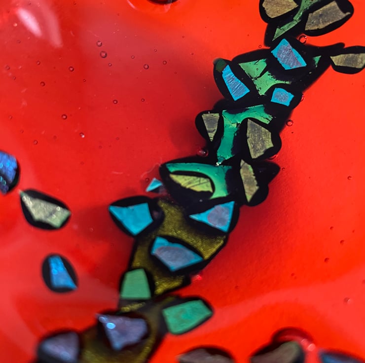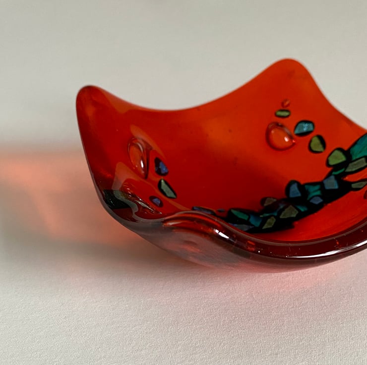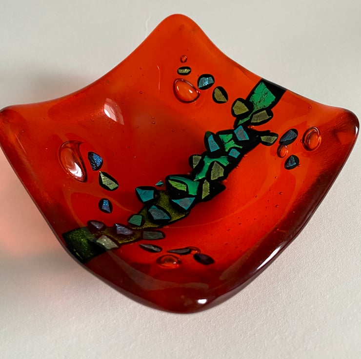 Previously £12 - NOW £6 - little dish is made from orange glass and small pieces of shiny gold, green and blue dichroic glass which have been fused in layers, some underneath and some on the top layer, giving it depth.