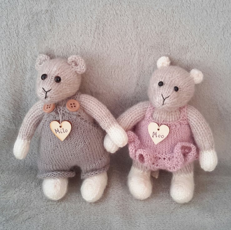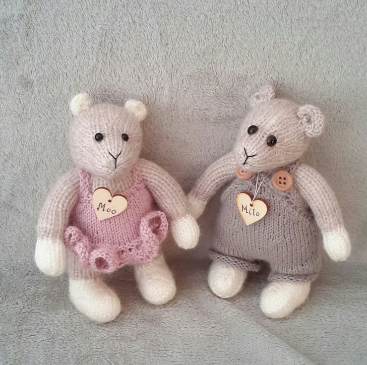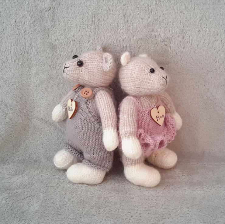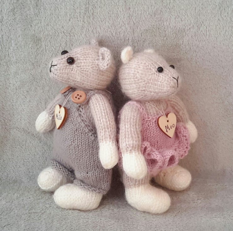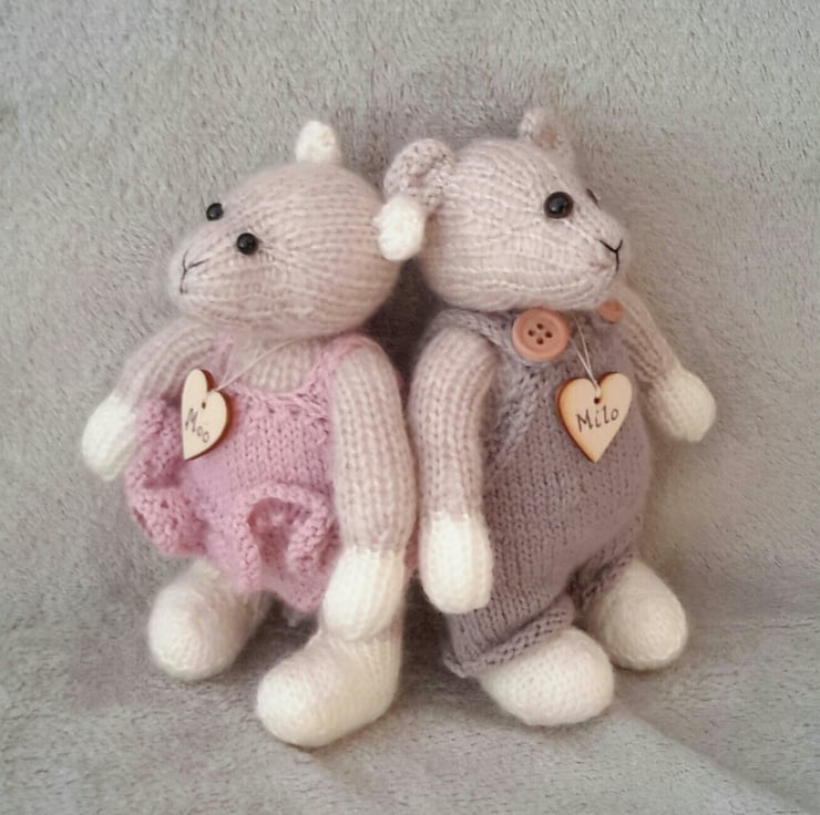 Milo and Moo, a pair of hand knitted dressed mice