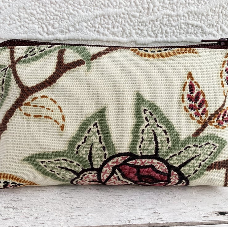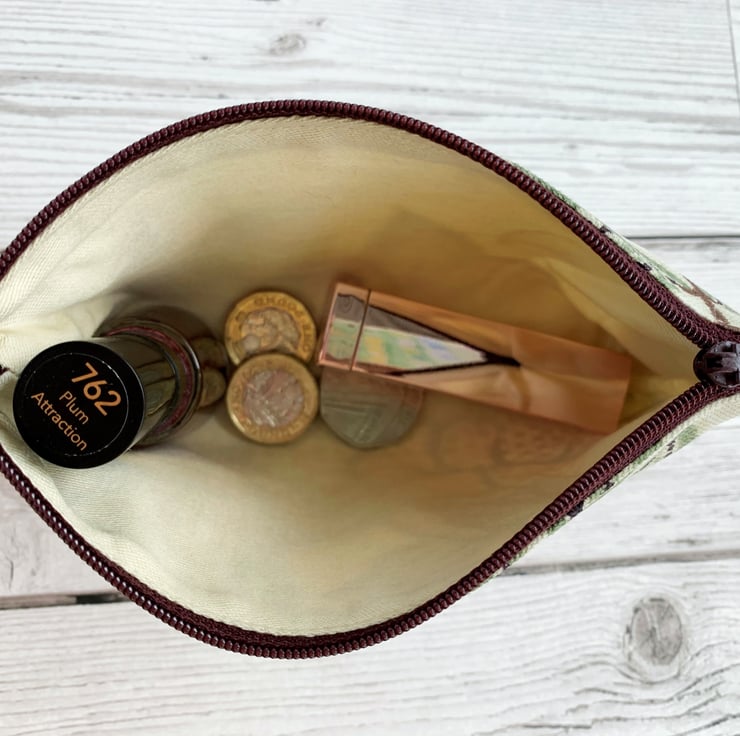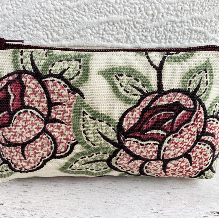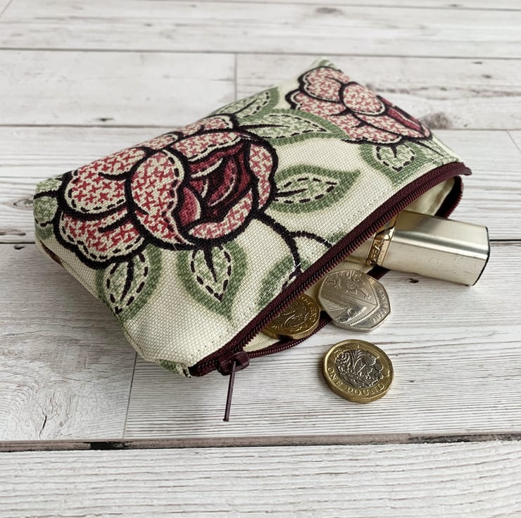 This large purse could be used as a coin purse and is large enough for bank cards and keys. It is also large enough to be used as a small make up bag or jewellery pouch. With its beautiful floral pattern, it would make a lovely gift, perhaps for a gardener.