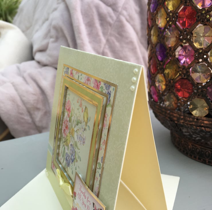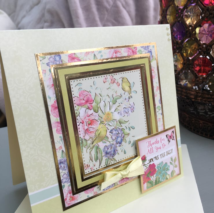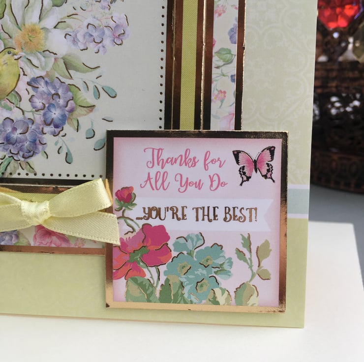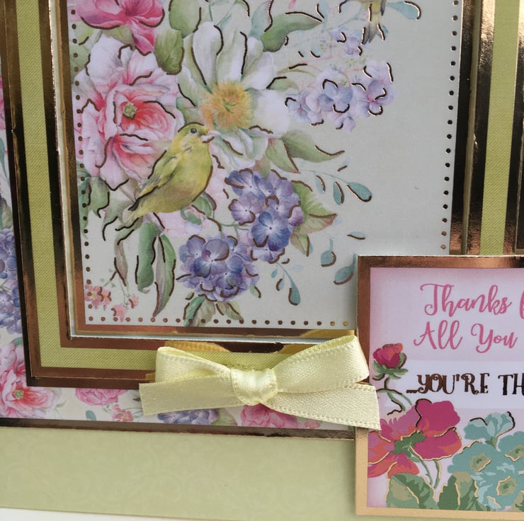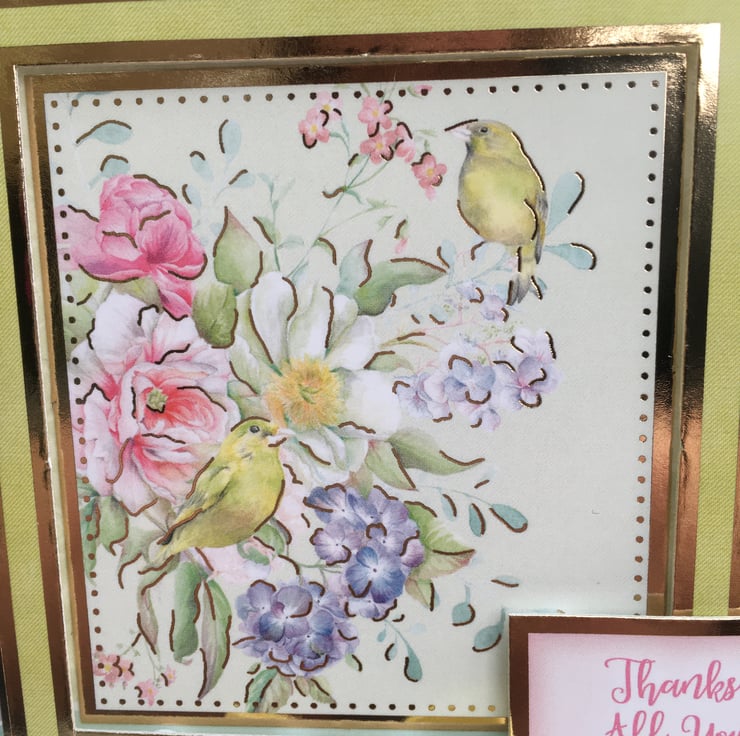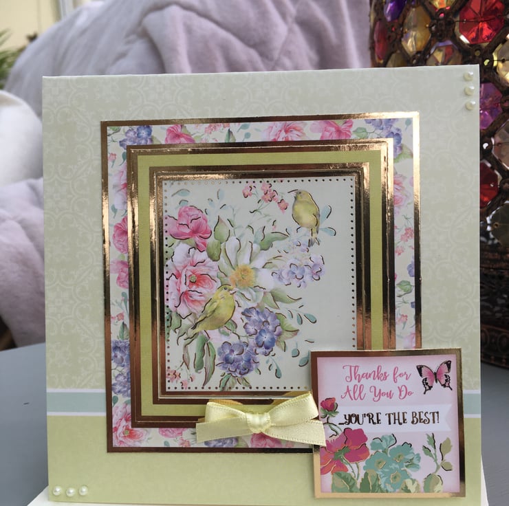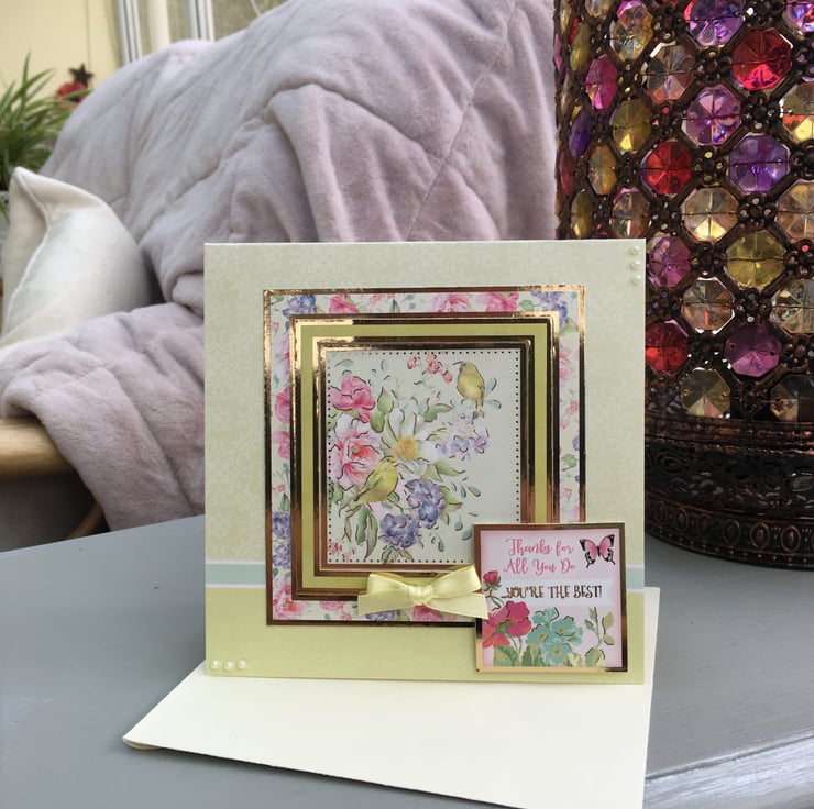 We all have a lot to be thankful for, especially at the moment. This feminine floral card is a lovely way to thank someone for all they do, just for being there if that's what you want to do. This 5x5 inch square card is a delicate floral design in a hazy watercolour effect. The main design is a spray of roses and stocks in gentle whites, pink and blue, it is accented with gold foiling. 2 goldfinches are perched on the flowers. The design is surrounded with 2 frames, one green and gold, the other is a floral and gold design. The greeting says Thanks for all you do...you are the best. This has more flowers and a butterfly. It is edged in gold. The backing card is pale green swirls with a pale blue and green border at the bottom. The design is finished with a pale yellow bow and tiny pearls. The inside is left blank for your own message.