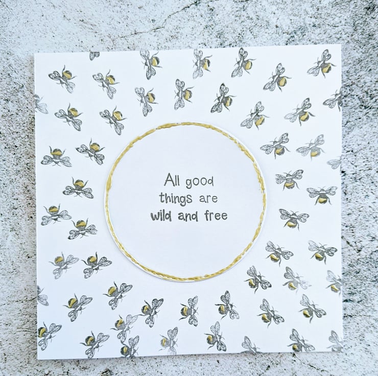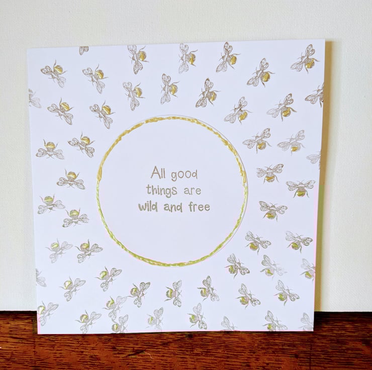 A large handmade greeting card with a swarm of bees circling around. Using inks on white card and gold pearl drops inbred bodies.