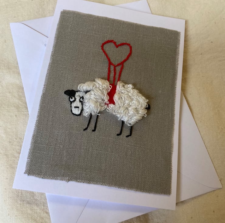 This lovely, fluffy sheep looks surprised - as well he might, as he is being lifted into the air by a heart shaped balloon! The sheep is hand embroidered onto natural linen and mounted on a greetings card. The card is 15.2cm x 11cm (4.1" x 5.7") and has been left blank inside for your own message. This card could also be framed as a small picture.