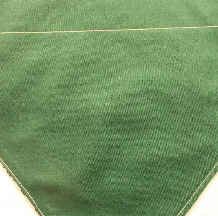 The bandanna is threaded onto to the collar. The collar channel is 5cms wide. Measurements are 21cms wide, 18cms center in length to point of triangle including the collar channel.