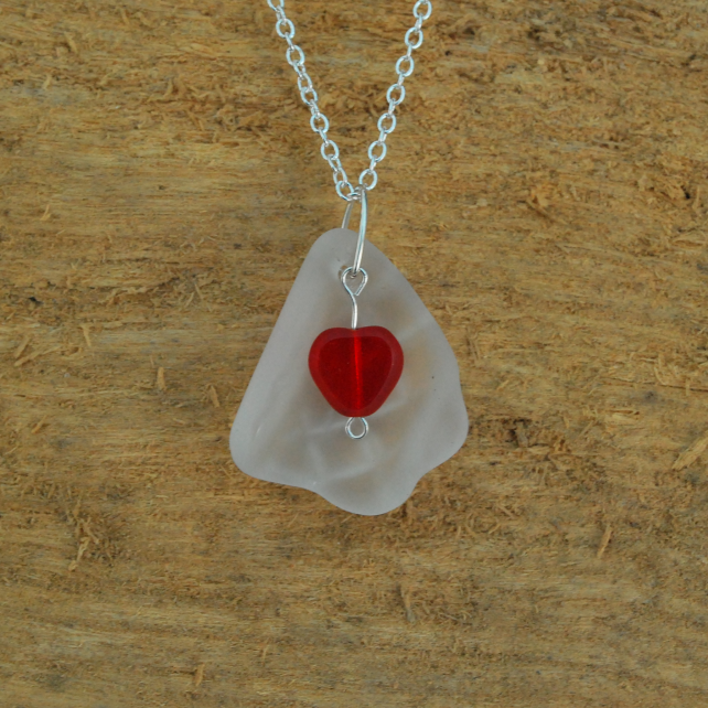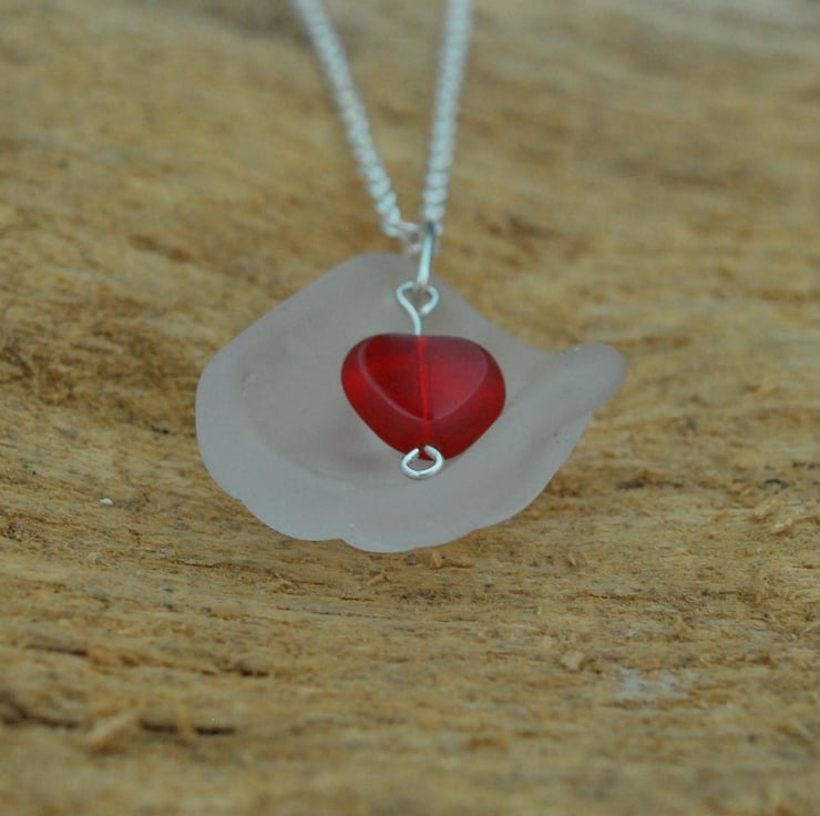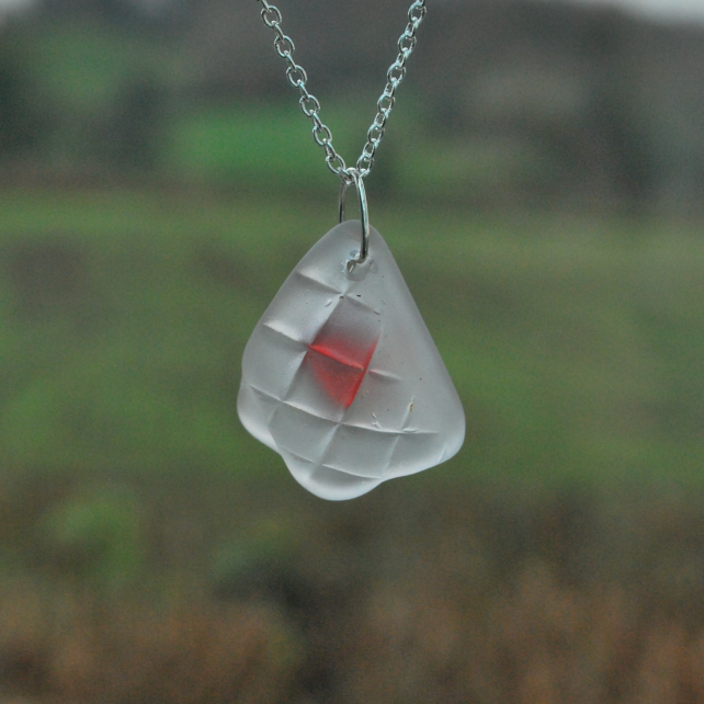 A rare find enabled us to make this unusual pendant. The beach glass we've used is a piece of a patterned glass dish, possibly originally cut glass. We've tumbled the pendant so it's rounded and smooth. The glass is very curved from the shape of the original dish, and we've used this to cradle the beautiful glass heart which hangs in it. The glass pattern makes the pendant more decorative, and looks lovely against a dark background. All the metal used in the pendant is sterling silver.