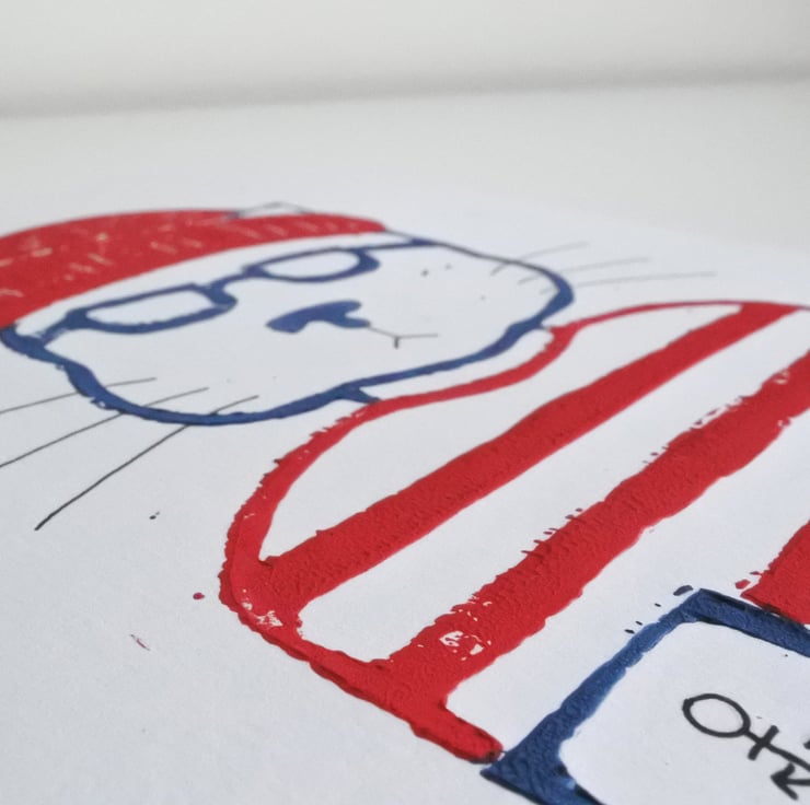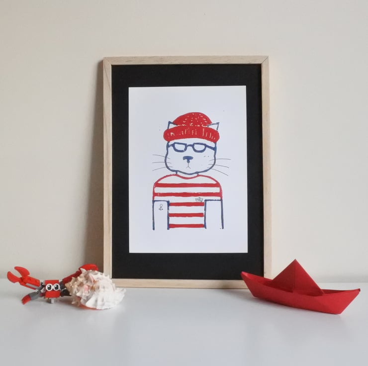 Horace the Fisherman Hipster Cat – Original Handmade Lino Print