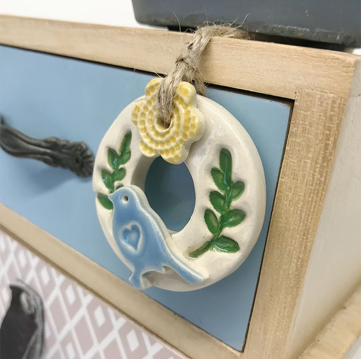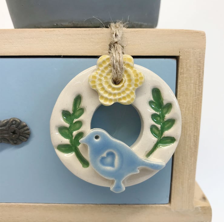 This titchy little pottery bird wreath decoration is made from white earthenware clay and glazed in a rich, glossy clear glaze. It has been fired twice. It measures 4.5cm diameter and hangs from a gold string Decorated on the front only.