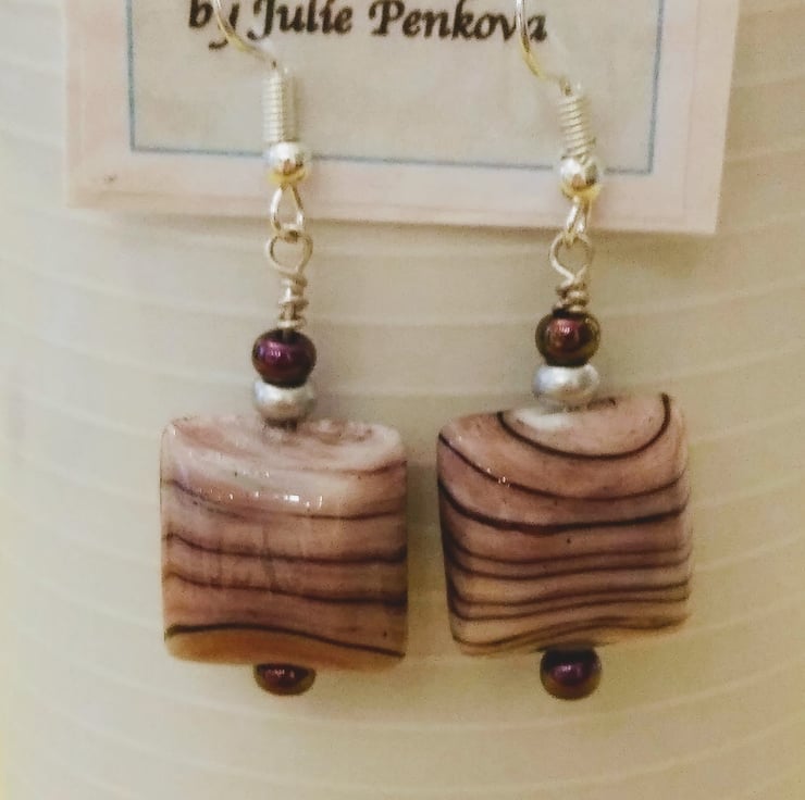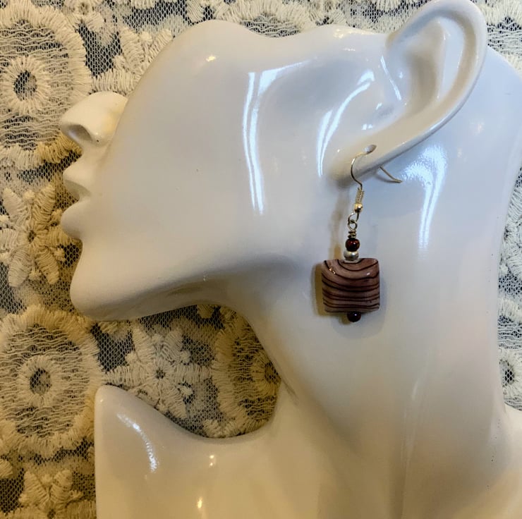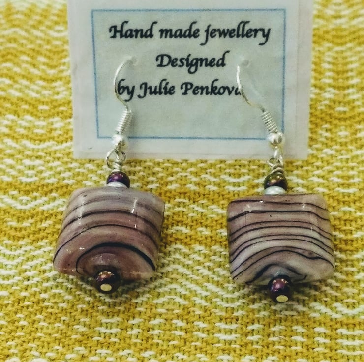 Square glass bead earrings Pink and black striped.