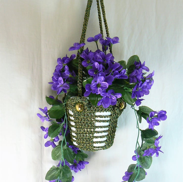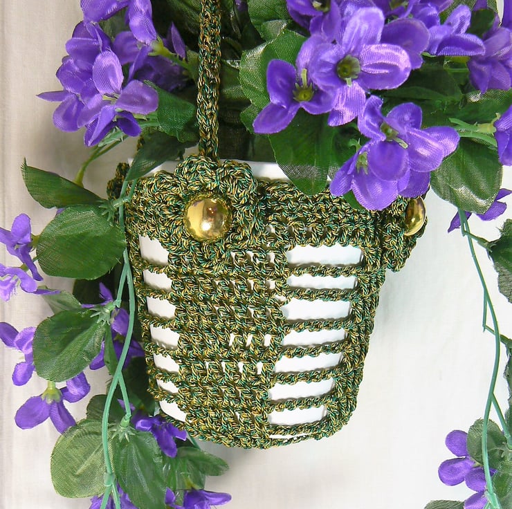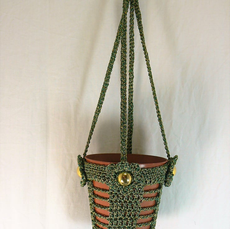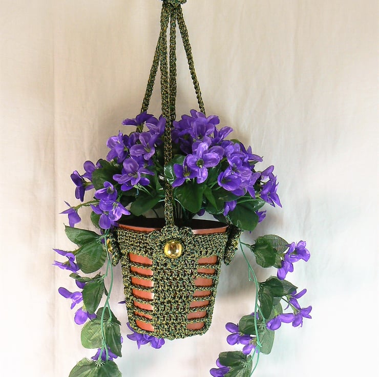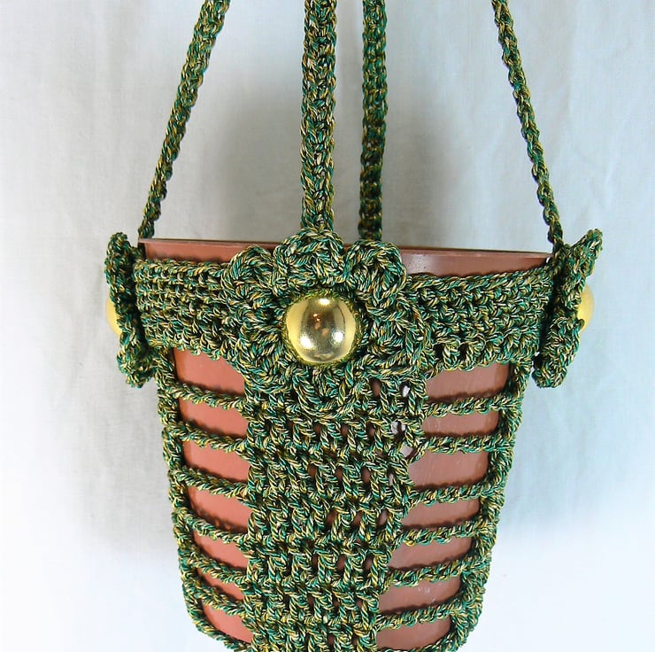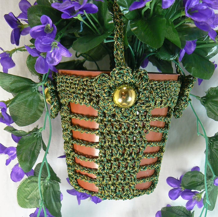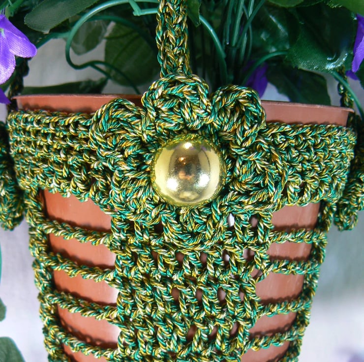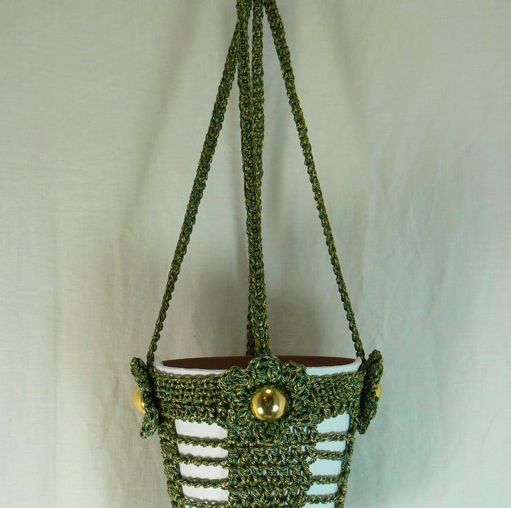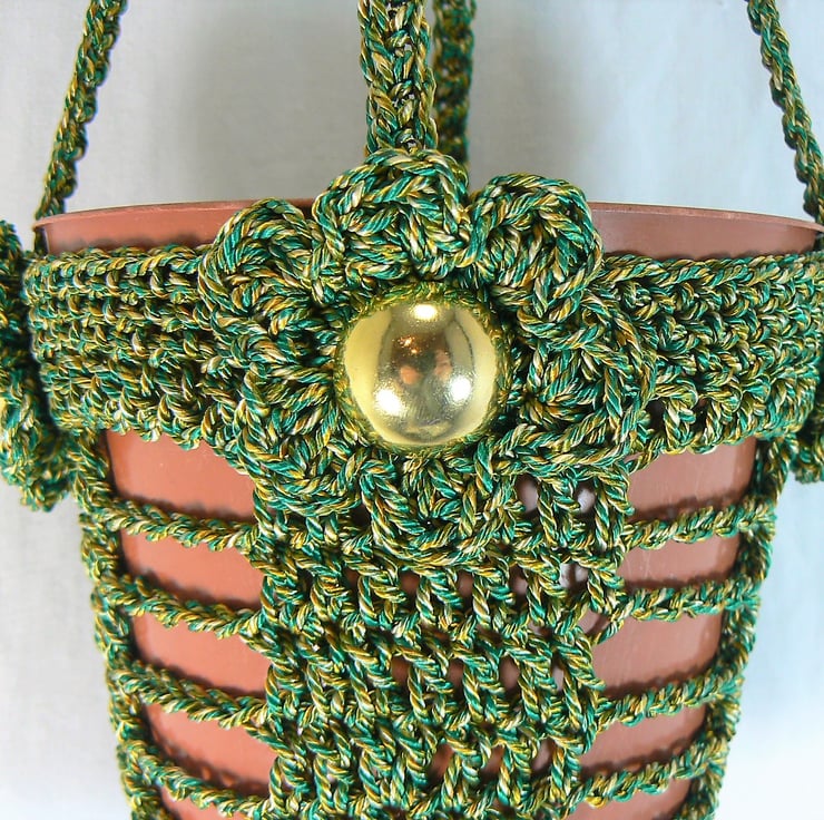 I have crocheted this hanging basket in a lovely emerald green cord that has gold with a hint of copper tone in the yarn too. I have worked 6 flowers for the hanger, one on each quarter of the planter rim and 2 at the top of the hanging ring - they are finished off with a gold dome button in the centre.