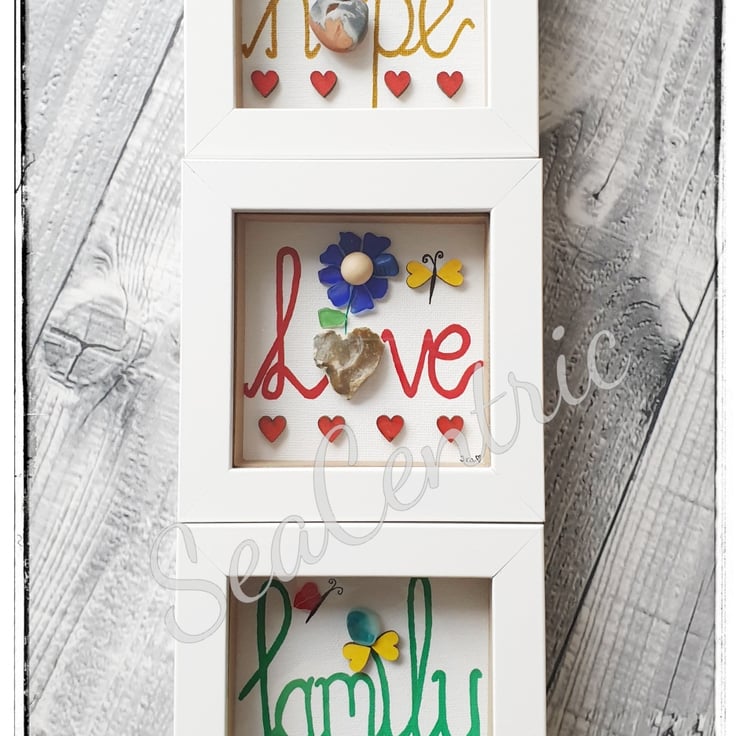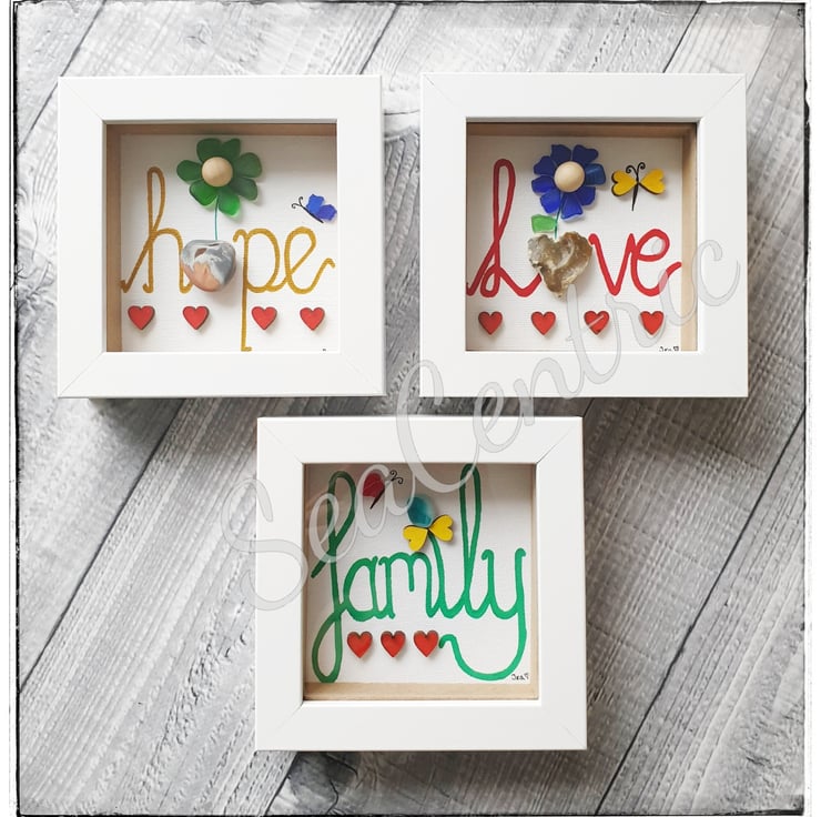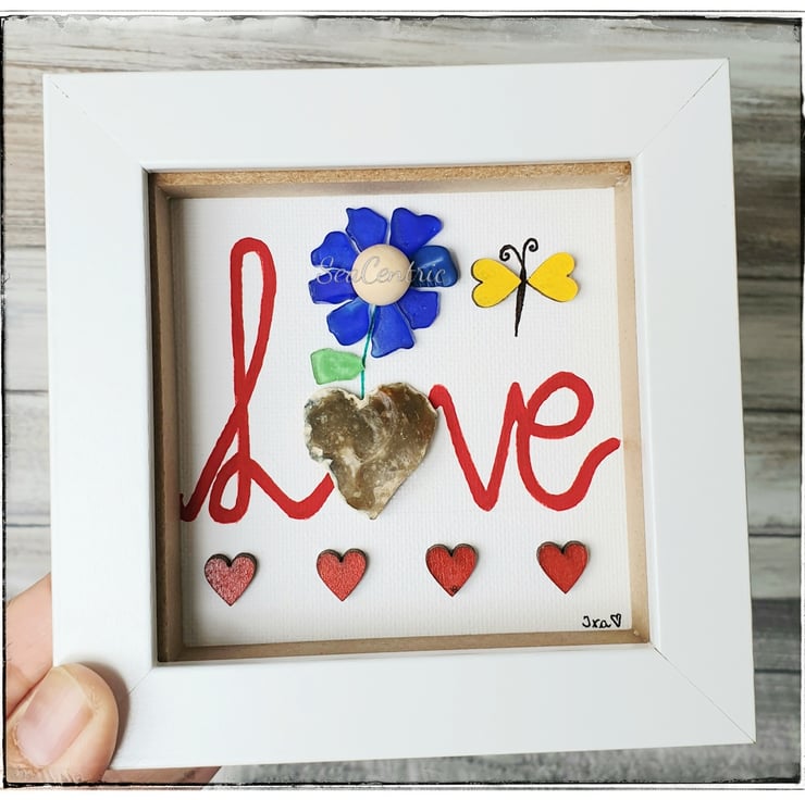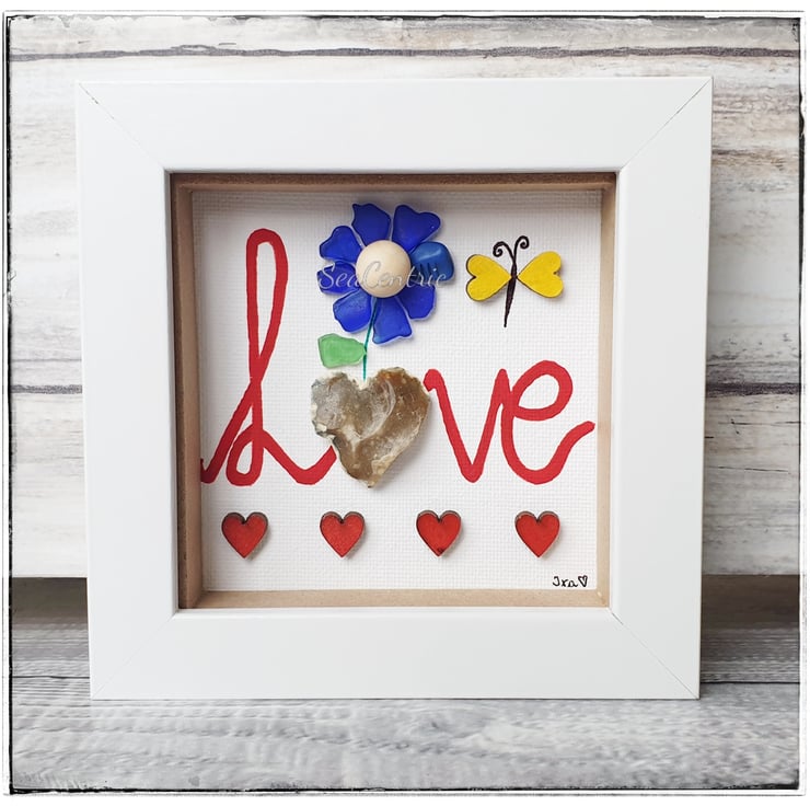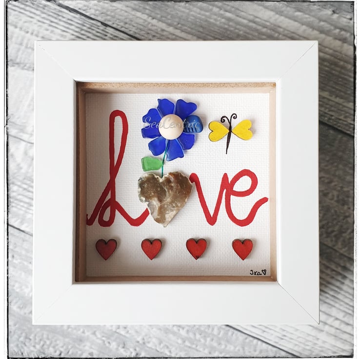 This canvas art piece is created with several seaglass pieces and pebble found personally on the shores of England. Wooden hearts are also used to create it. The box frame measures appropriately 12cm x 12cm and will come with glass. Photos were taken without glass to avoid reflections.