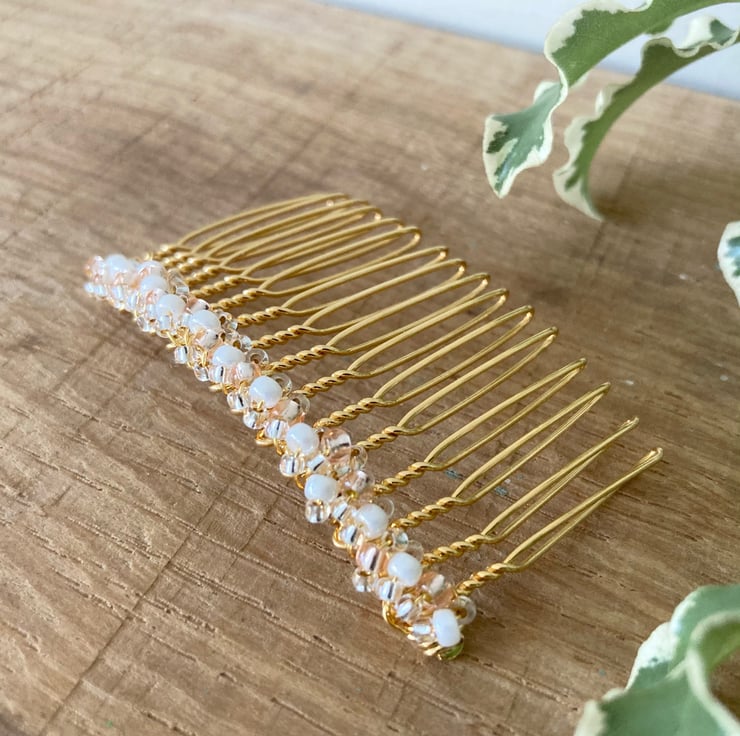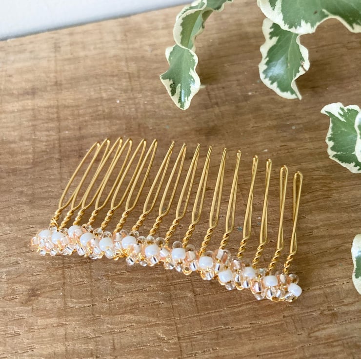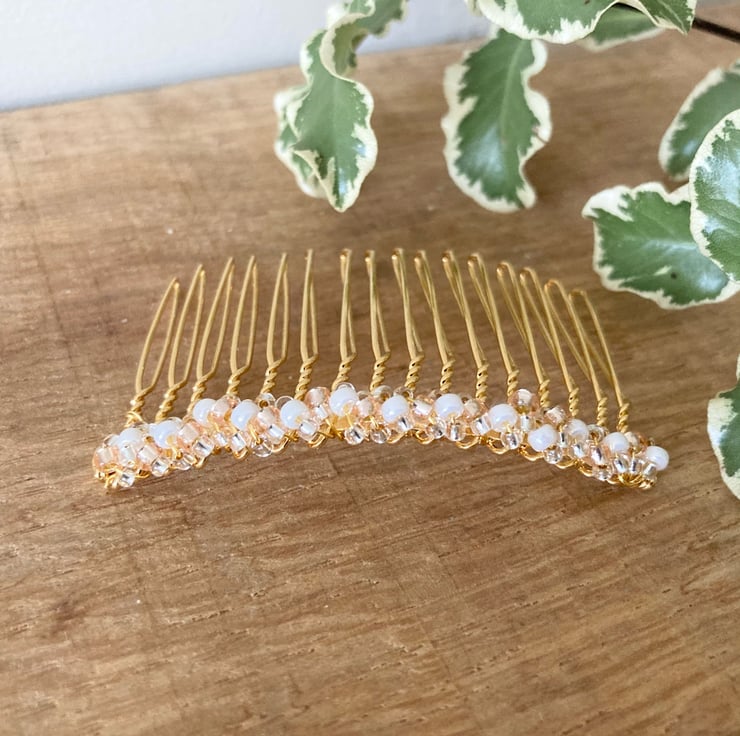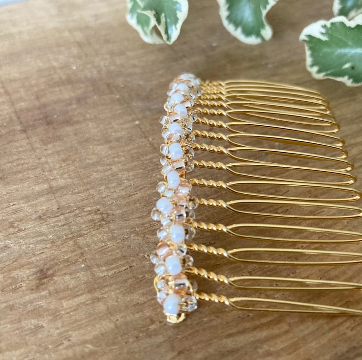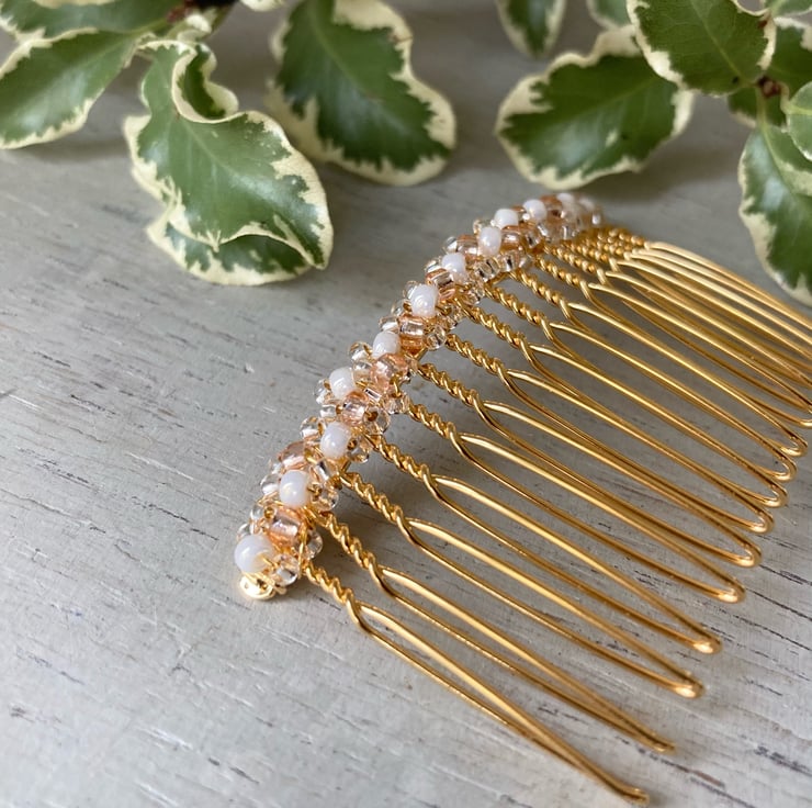 Gold-plated hair comb with tiny seed beads in pearl, crystal and peach colours. The beads are hand-wired onto the comb, and can be done in any colour combination - please ask for other colours. The comb is approximately 6cm across and 3.5cm length.