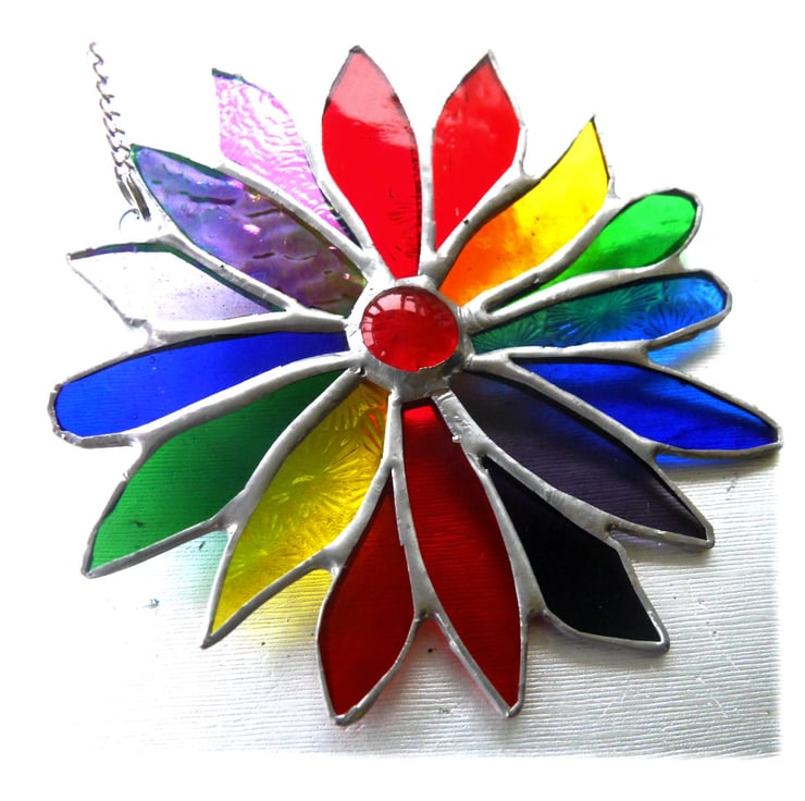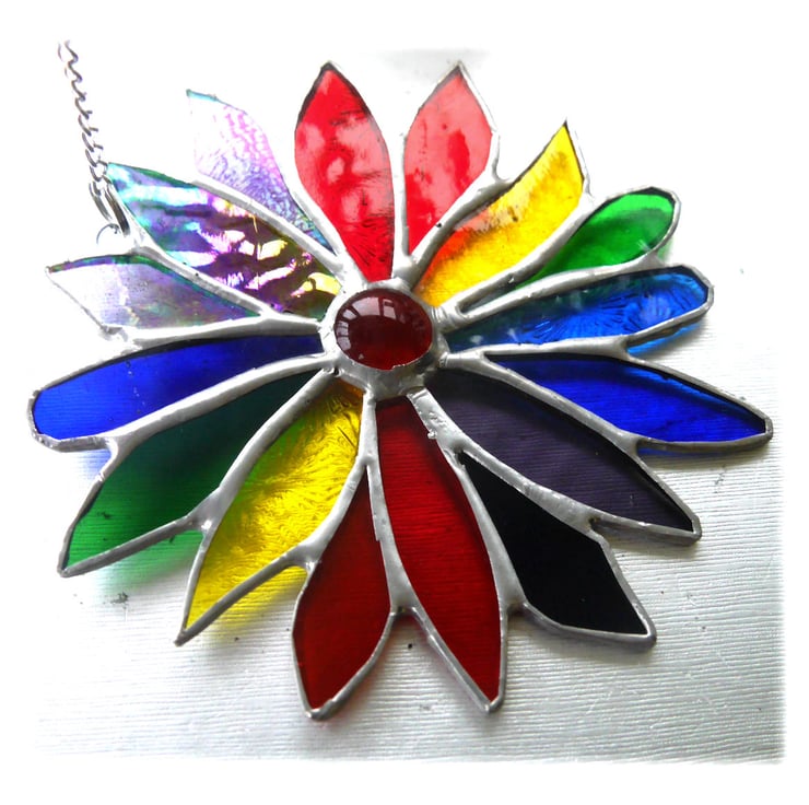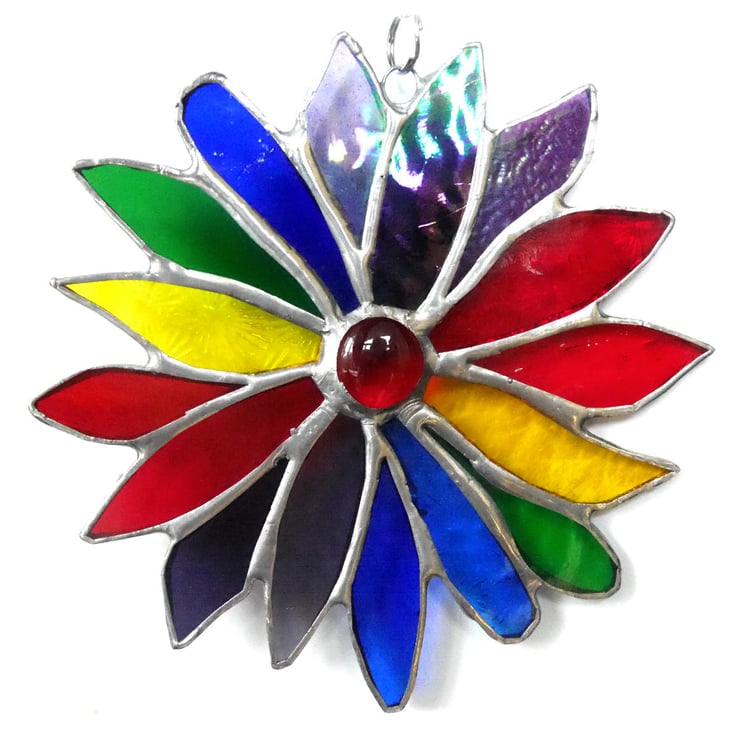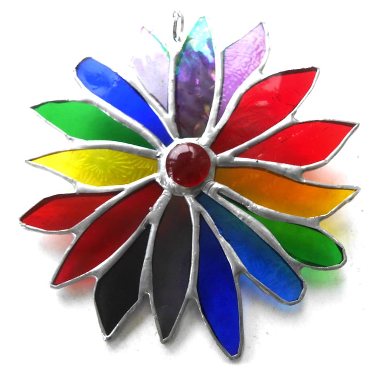 The flower has 16 petals, all slightly different shapes and the colours pass through the spectrum of the rainbow, twice. In the centre is a bright red glass nugget.