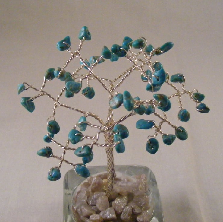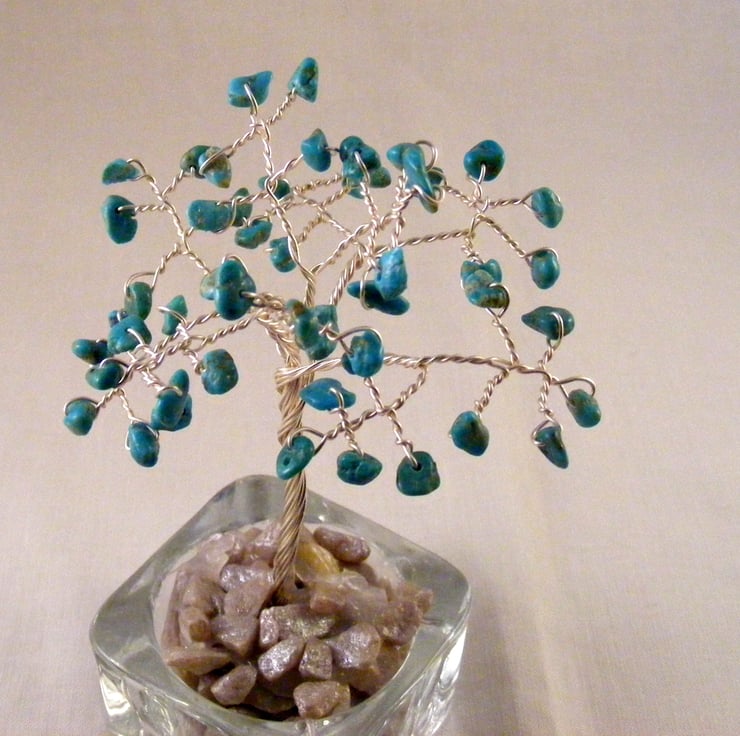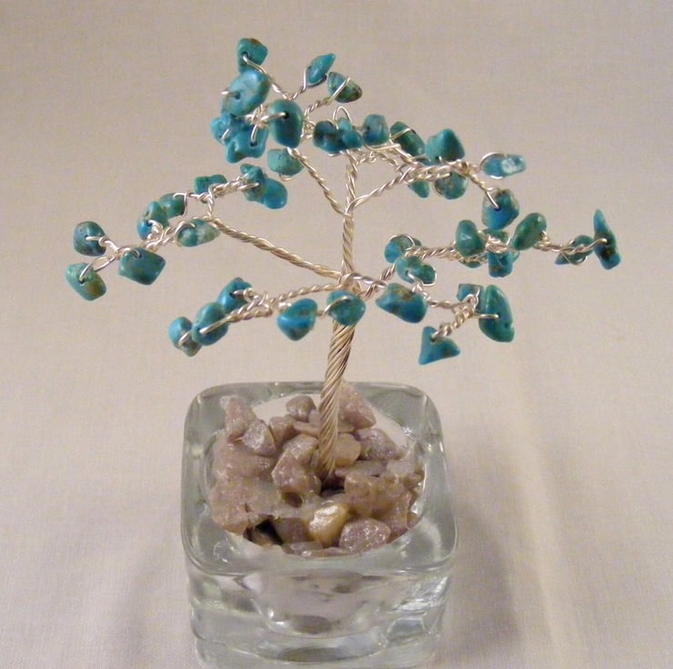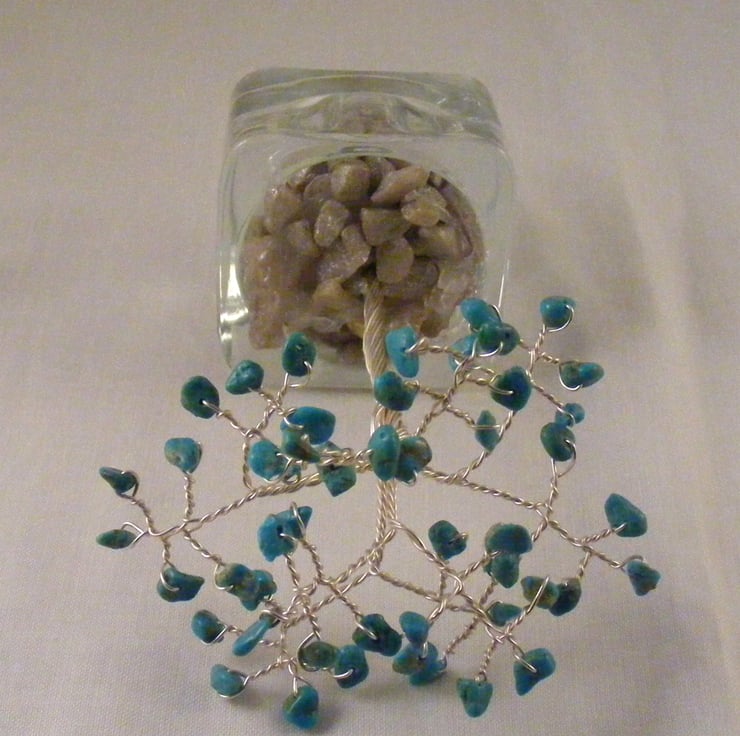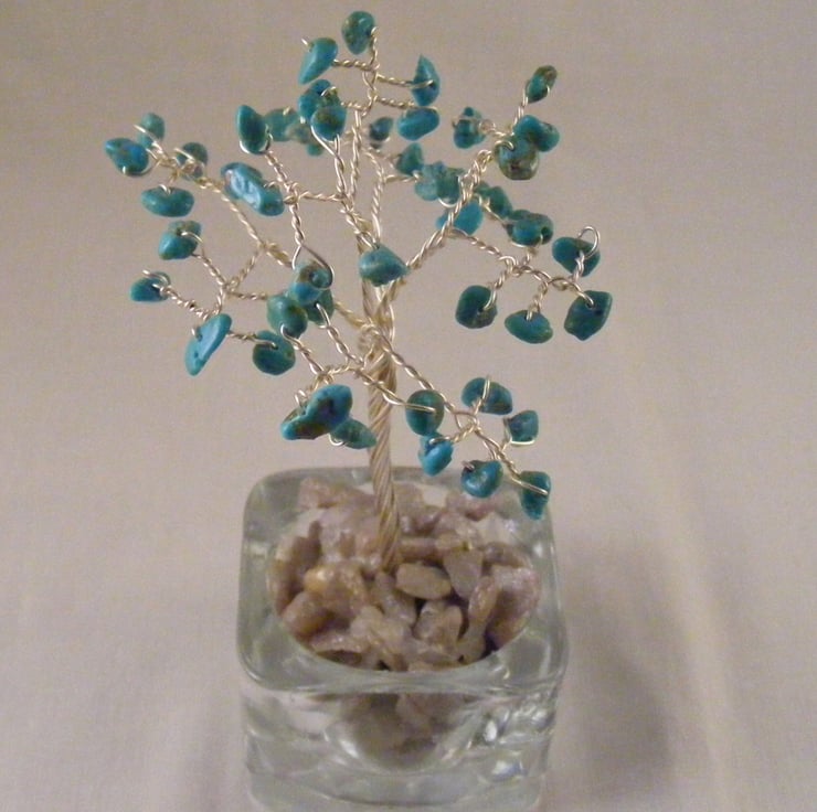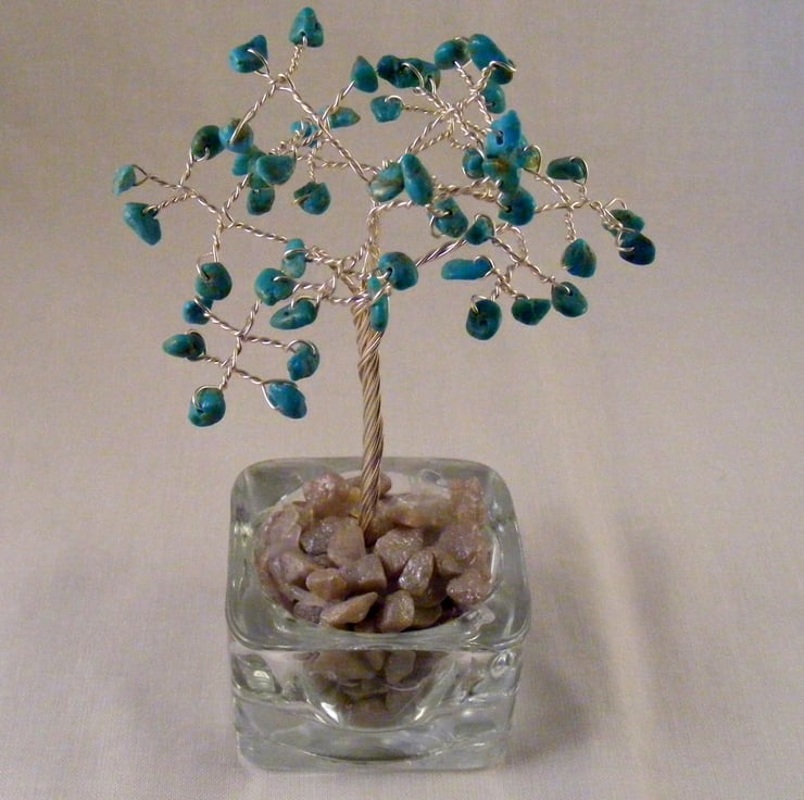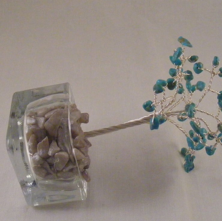 I've handmade this lovely gemstone tree using, genuine turquoise nuggets, silver plated wire, 5 x cm square glass holder, pearlescent pebbles and glue.