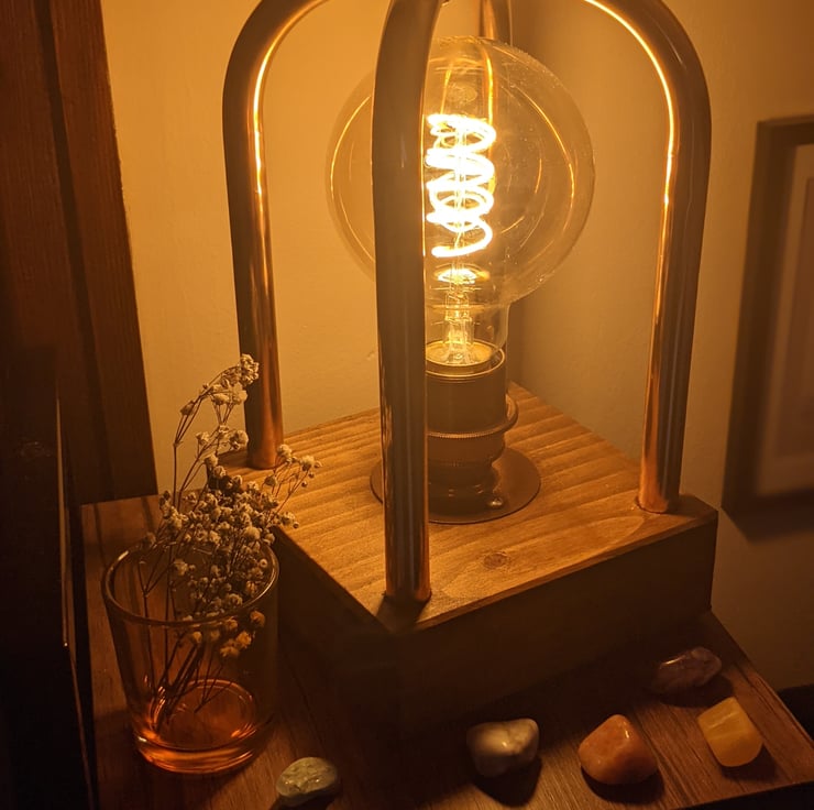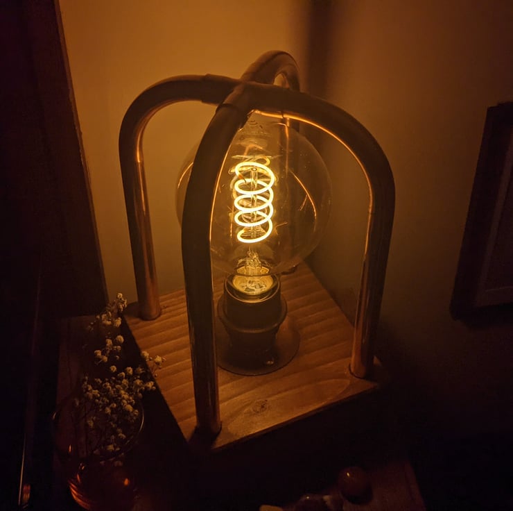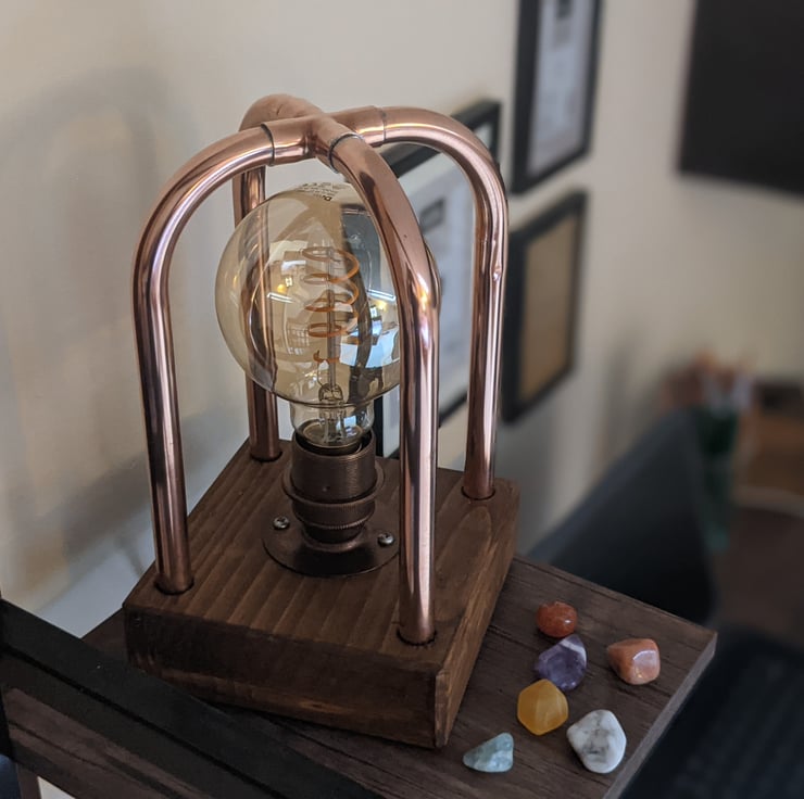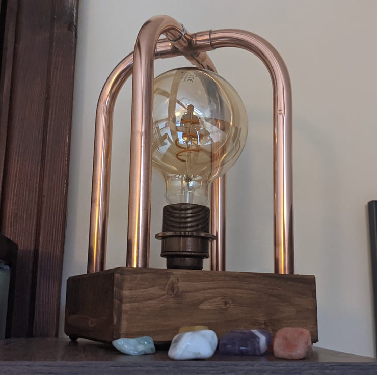 A copper lamp with a difference, made using new 15mm copper pipe that's been gradually curved 90deg to conform to the concentricity of the inner globe style bulb, each piece is then soldered into a copper cross piece then meticulously polished to a mirror finish. The Included filament style LED bulb gives off the really pretty super warm light that you can find with filament bulbs but with the durability of LED bulbs so no more swapping out expensive bulbs every month. The Lamp also comes with an inline switch for your convenience. The Base is made from stained Pine wood and comes with rubber feet to protect your surfaces.