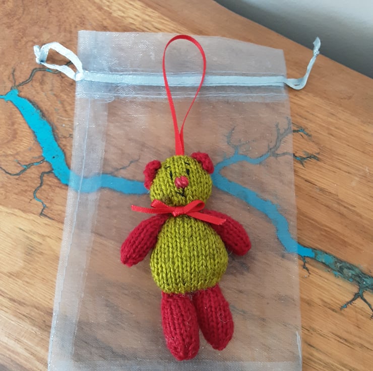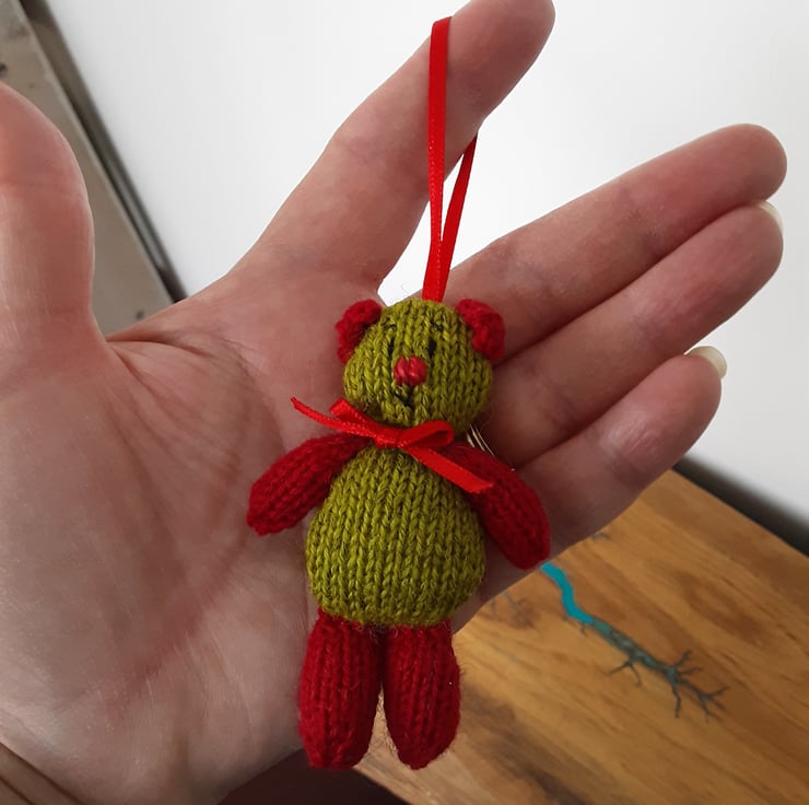 He is knitted in green and red 100% wool. He has a red ribbon tied around his neck and attached to a red ribbon.