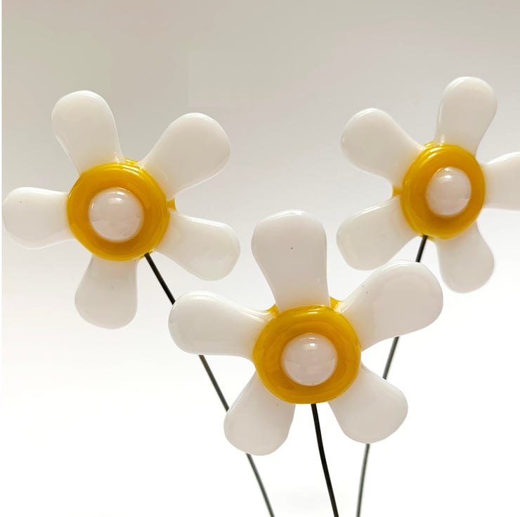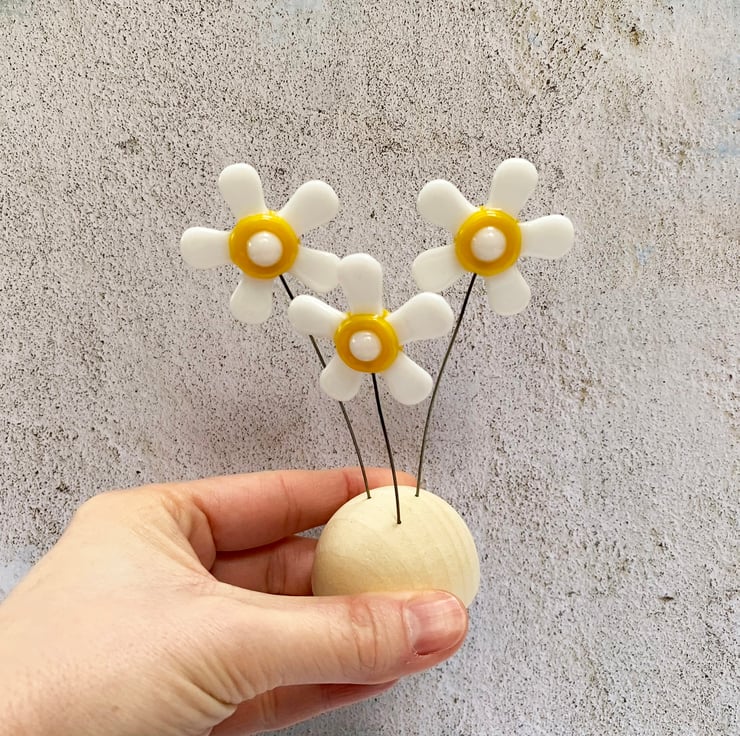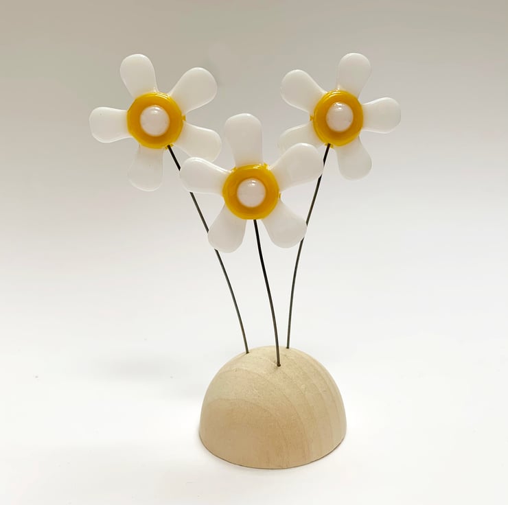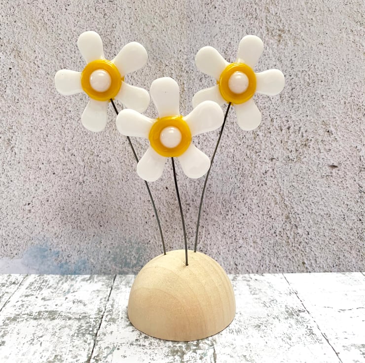 Fused glass freestanding piece on a solid wood base. This dinky sculpture combines white and yellow fused glass flowers, a solid wood base and wire stems. This looks lovely either on a window sill or on a mantelpiece. Each sculpture is completely unique.