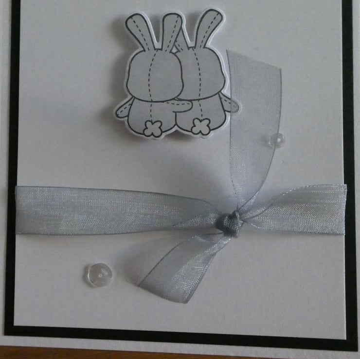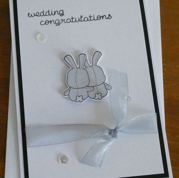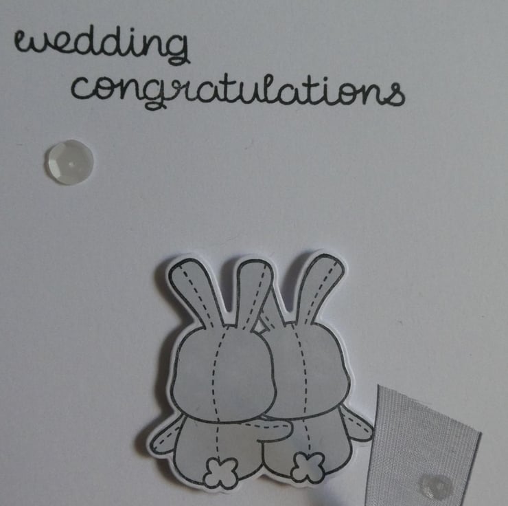 This tent fold card has been hand stamped with the message wedding congratulations and shows two cuddling grey bunnies which have been attached with foam pads to raise them from the card front.