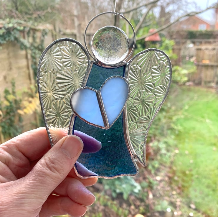 This particular angel has been made from light blue wissmach glass, clear florentine glass has been used for the wings and the heart is white streaky glass (although in the photo it looks blue). A large glob has been used for the head and wire for the halo.