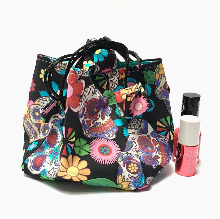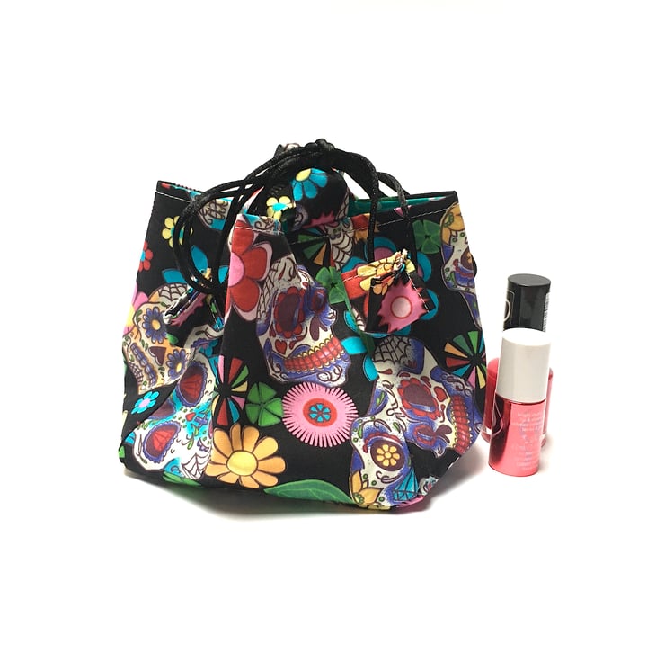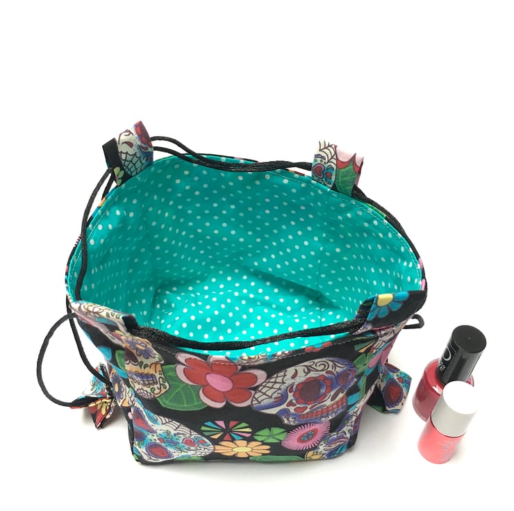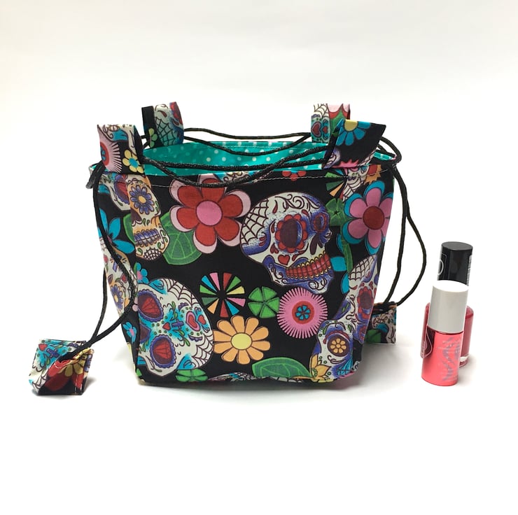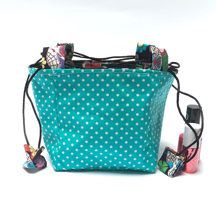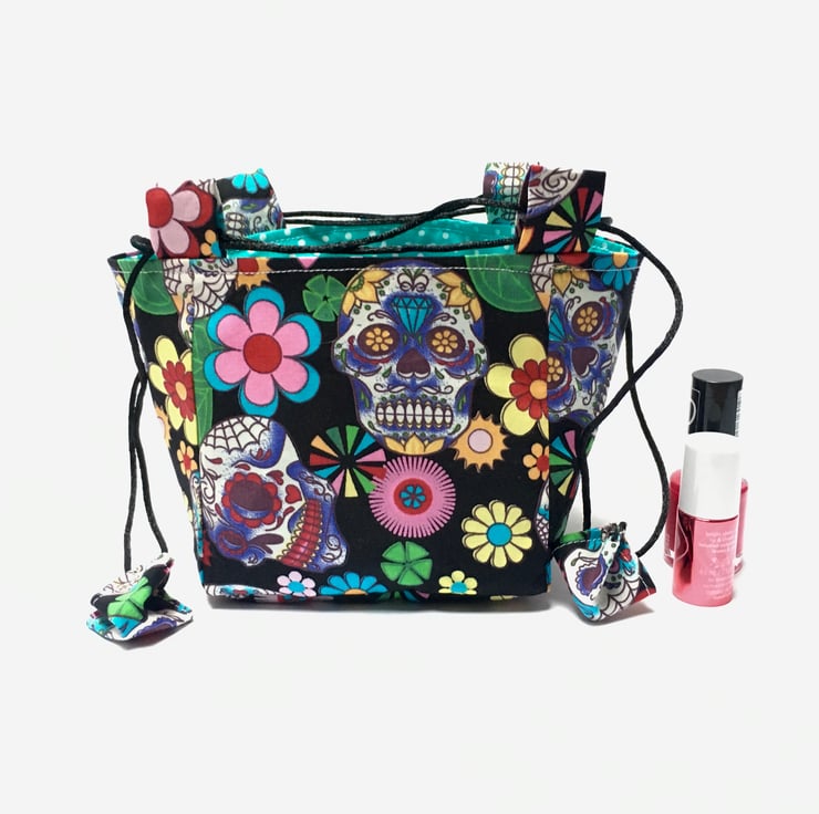 A bright and vibrant cotton fabric with multicoloured flowers and skulls on a black background has been used for this Japanese rice bag. The inner fabric is a complimentary turquoise spotty dots cotton fabric. The ties on the drawstrings are black cord finished with a traditional covering. The bag is reversible.