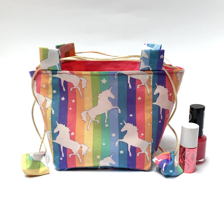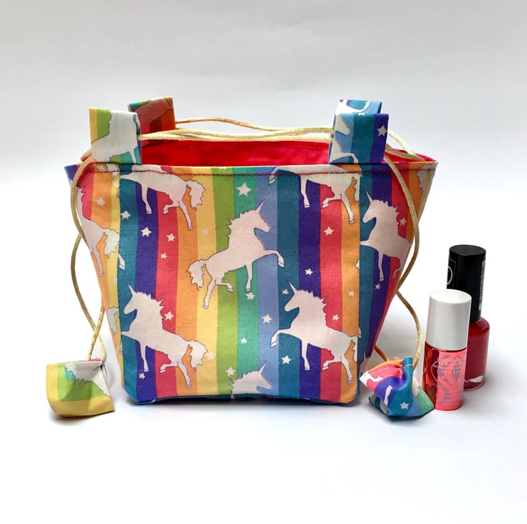 The Japanese fabrics I have been using to create my masks have encouraged me to explore Japanese culture and accessories. I love the multicoloured fabric and unicorns on this fabric, which creates a fun bag.