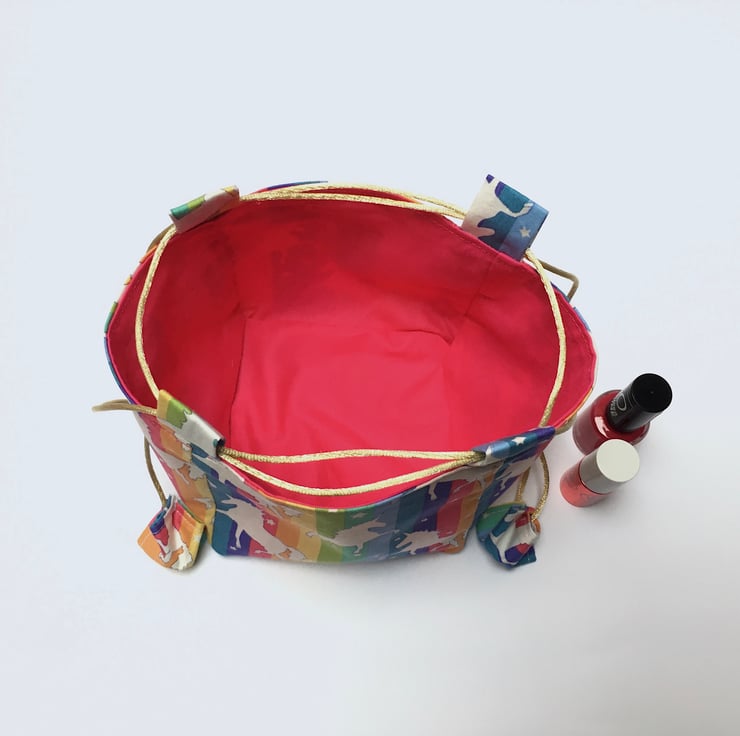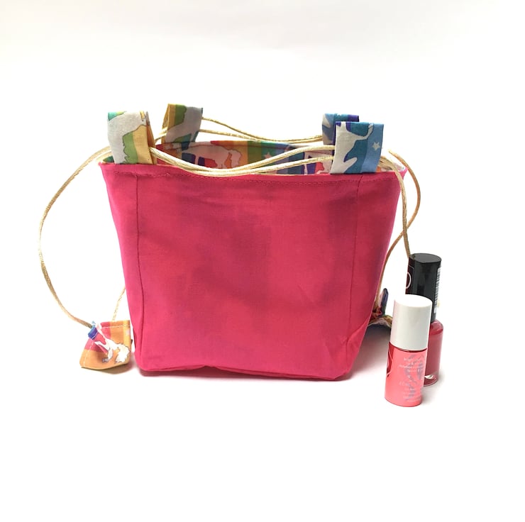 This is a cheerful rainbow fabric with white unicorns and stars print Japanese rice bag, with a complimentary pink fabric interior. The bag has gold cord ties, finished with a traditional covering. The bag is reversible.