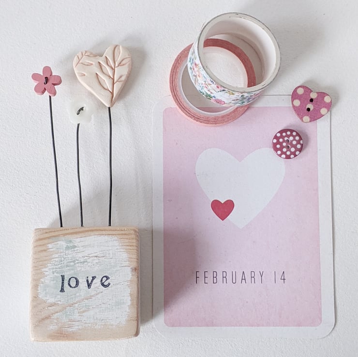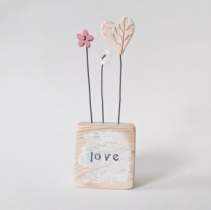 A clay Heart stands on a wire stalk in a painted wooden block.