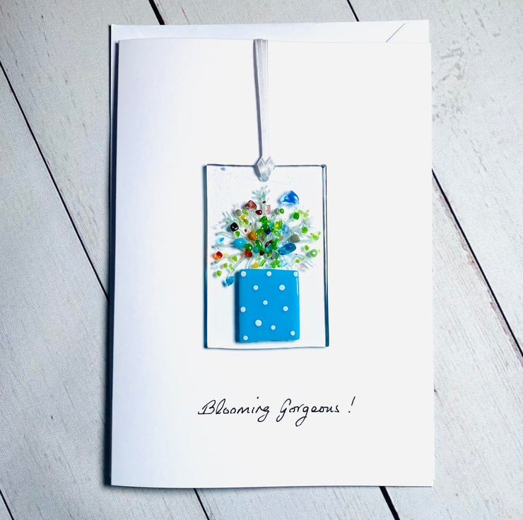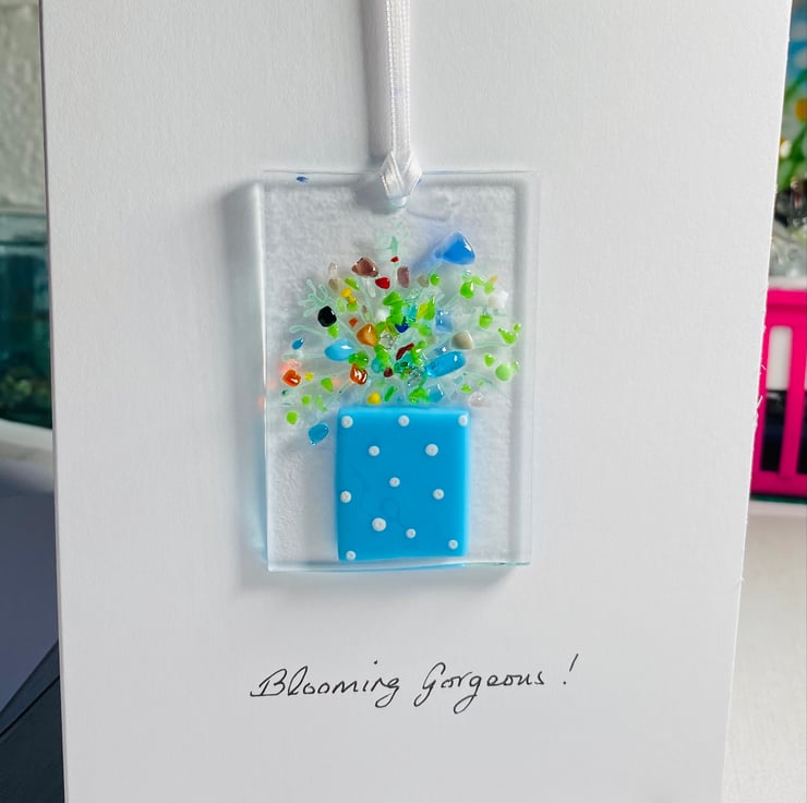 These keepsake cards are perfect when ever you want to send a small gift and a card. The fused glass hanging decoration is drilled and strung with ribbon to hang any where in your home as a nice reminder of a special occasion.