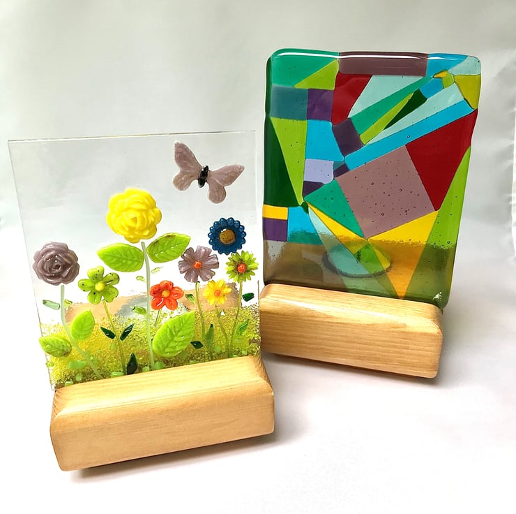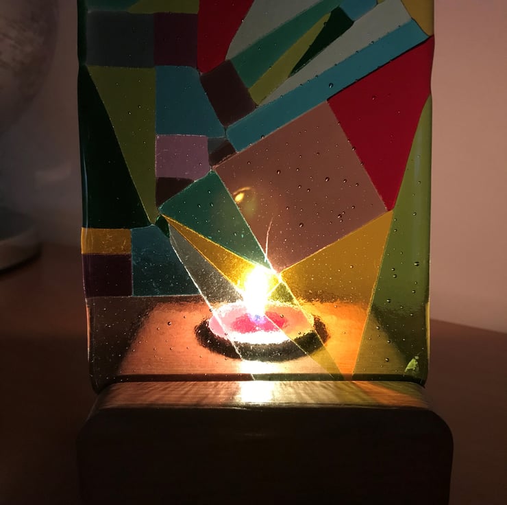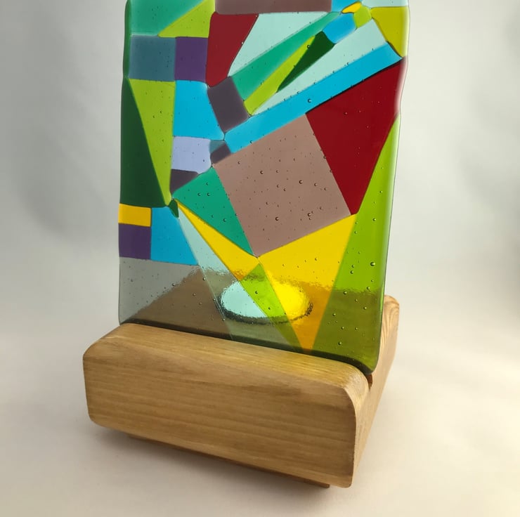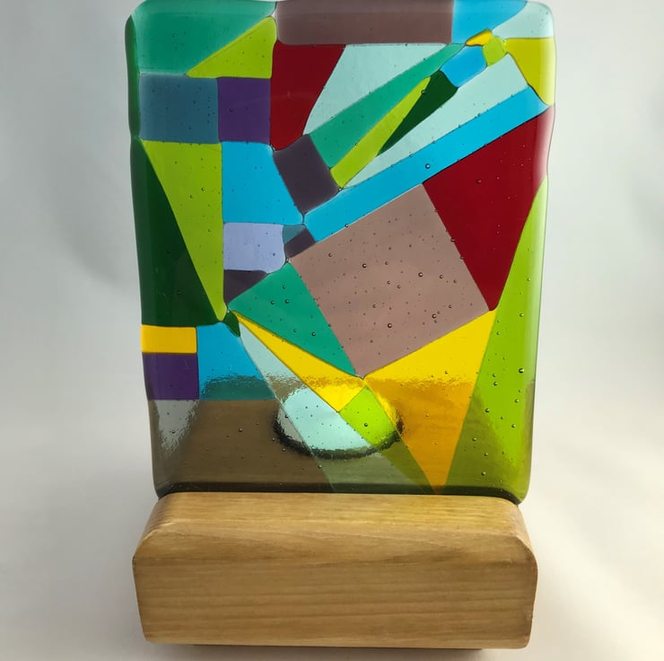 Measuring 13cm x 10cm this vibrant abstract experimental glass panel has been made from individually cut pieces of coloured glass fused at 800 degrees Celsius. It stands in a handmade redwood stand (10cm x 10cm x 4cm), with a recess behind to hold a tealight to make the glass glow in the candle light.