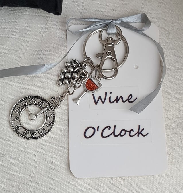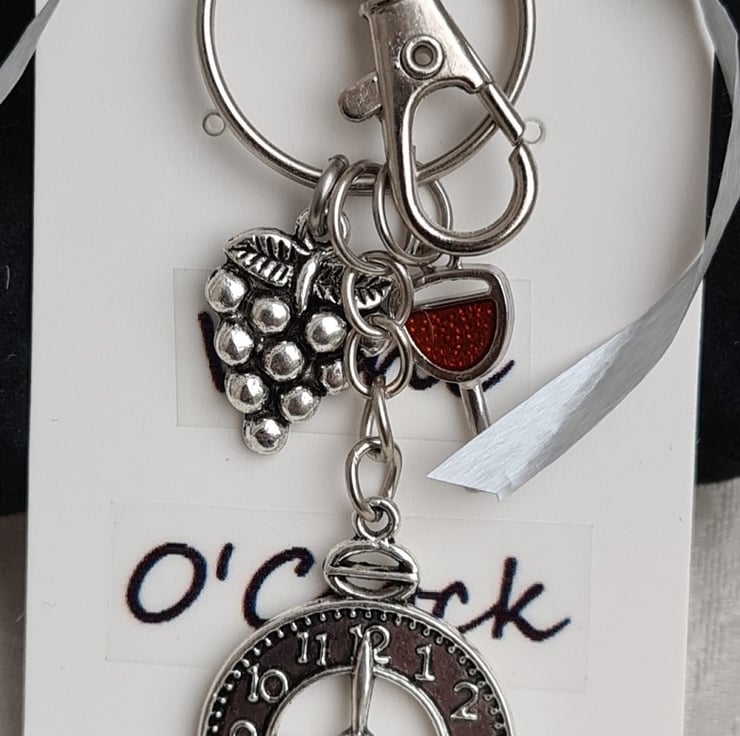 A fab key ring for a wine lover. Wine Time key ring is a reminder that Wine O'Clock is a time to relax and unwind with a glass or two. Key ring consists of a Clock face, bunch of grapes and Red wine glass charms. Great as a gift for a Wine lover.