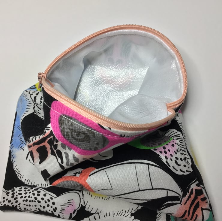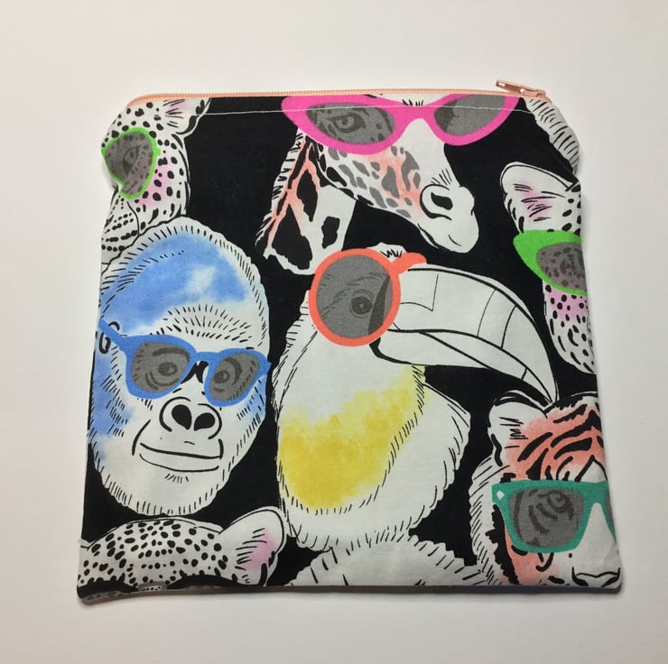 Made from a bright fun Alexander Henry fabric with various animals in sunglasses. This bag is lined in a waterproof PUL certified food safe lining and can be used as a wet bag for swimwear, or a reusable sandwich bag. The PUL fabric is washable up to 300 times and has been certified food safe by the manufacturers.