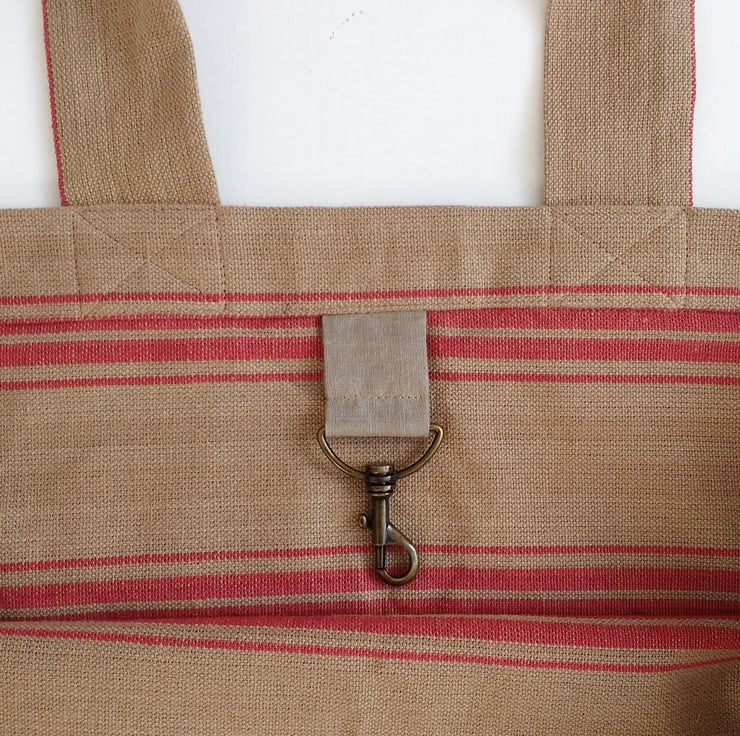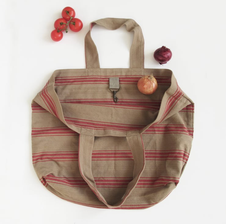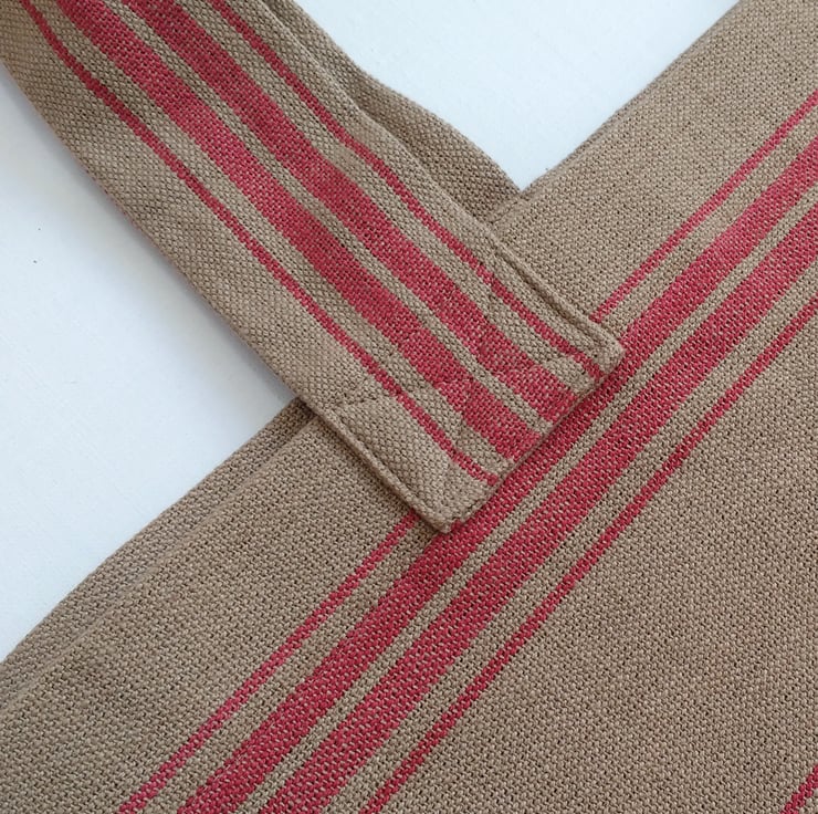 The perfect companion for shopping in your local food market, it has lots of room to stock up with bread, veggies, cheese, flowers... Made from 100% cotton in natural tones of taupe with dusky red woven stripes, it has a lovely rustic look. The bag's generous size also makes it brilliant for picnics and beach holidays with lots of space for towels, swimming stuff and snacks!