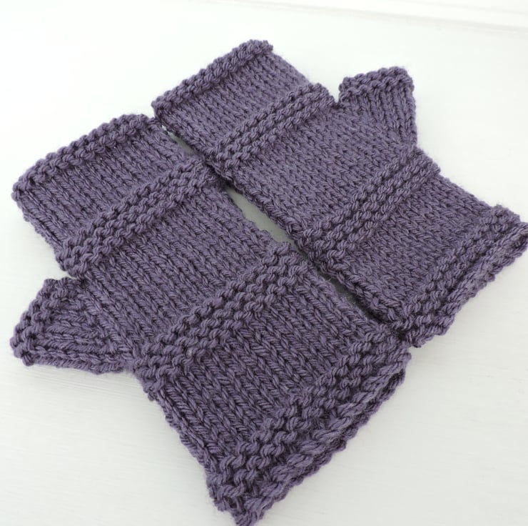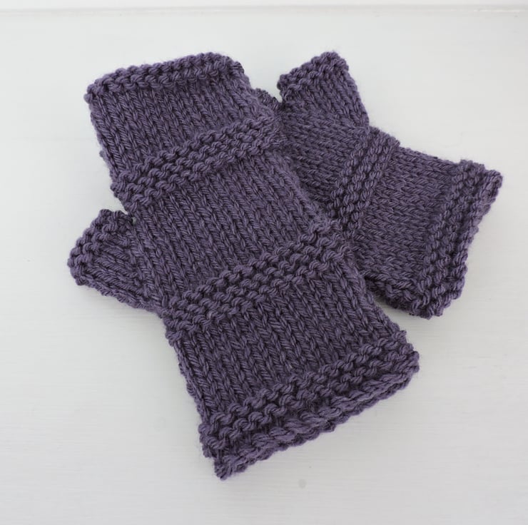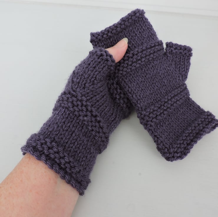 Clearance Sale now £5.00 These fingerless mitts have be knitted in an acrylic dark purple chunky yarn. They have a garter stitch cuff and the body had been knitted with stocking stitch and garter stitch in alternating blocks. Beautifully soft and warm.