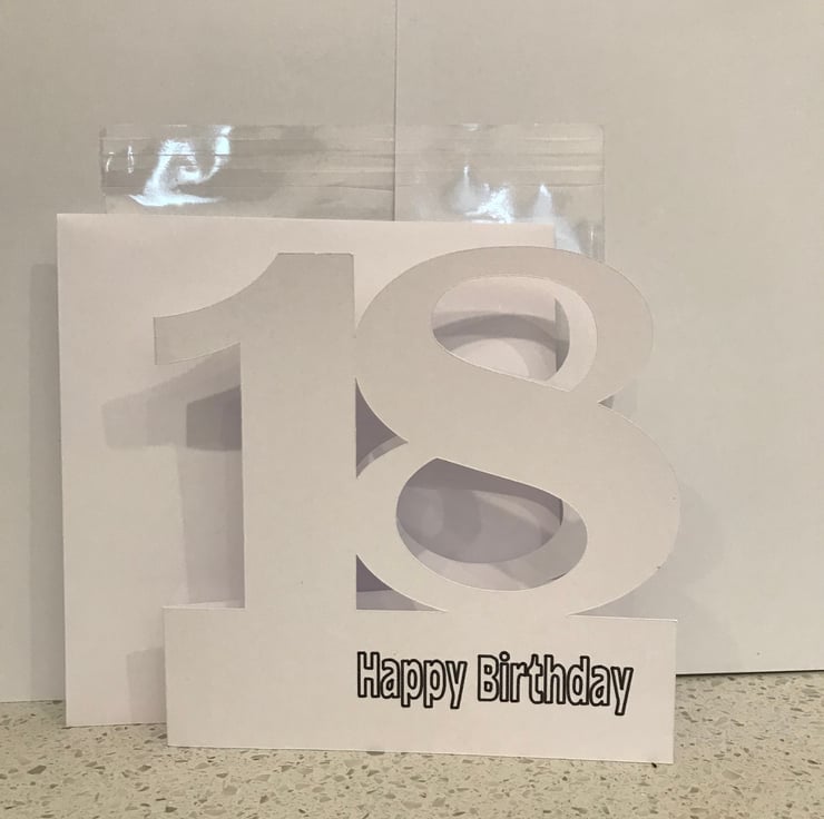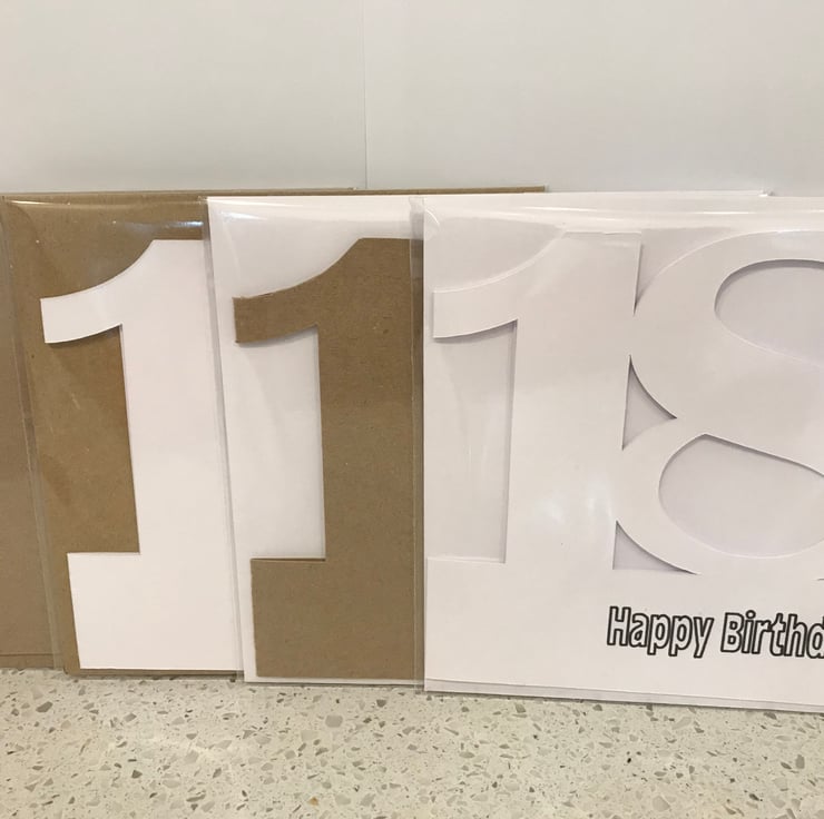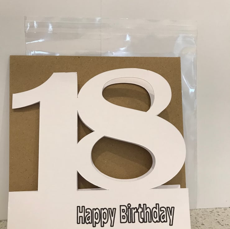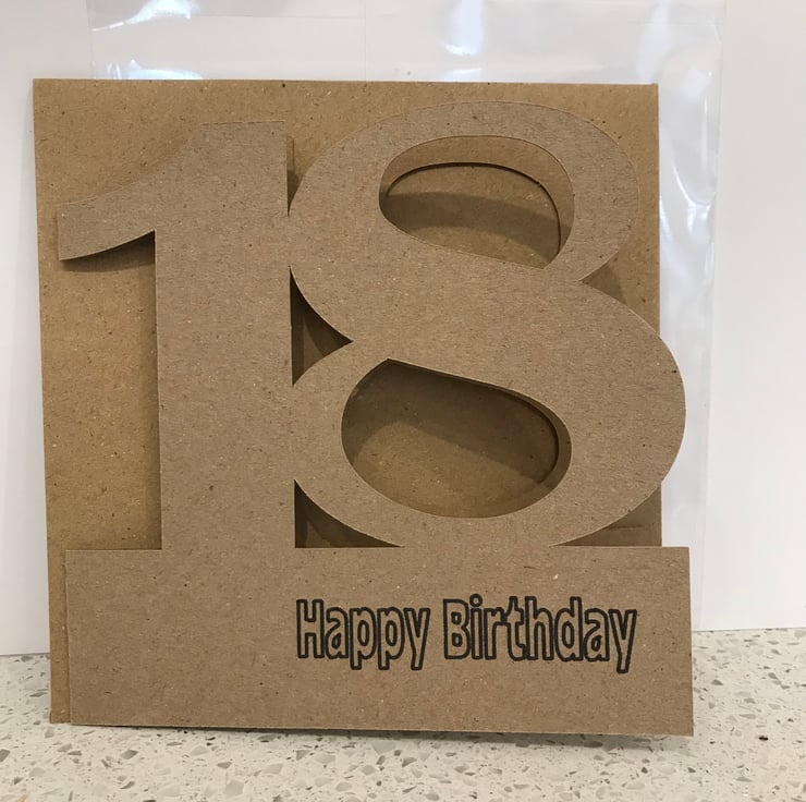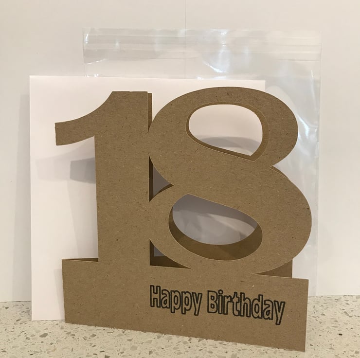 The eighteen on the card is cut out showing a one and eight with the words happy birthday on the front, with a sticker on the back with the words Designed and Handmade by Kind Crafts.