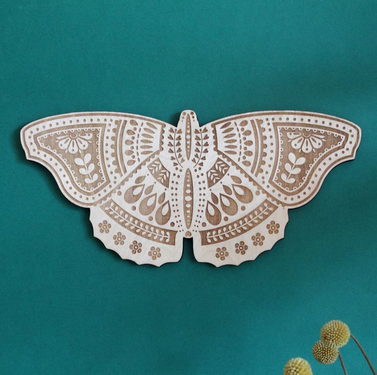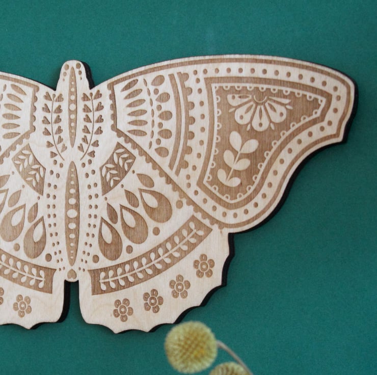 This pretty butterfly is intricately etched with a leafy, floral folk art style pattern, and will sit proudly on any wall.