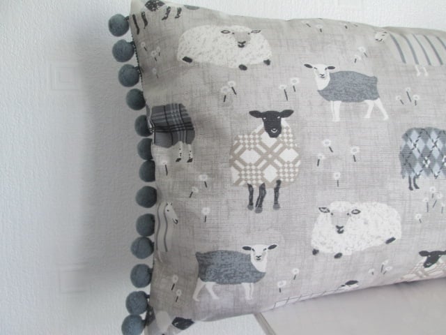 Grey sheep cushion cover with cream back with central zip and grey piping