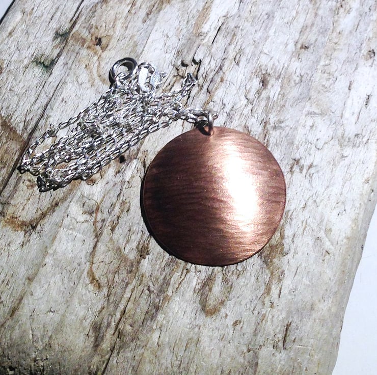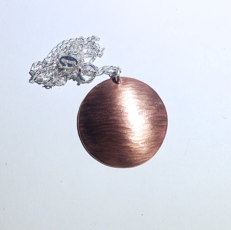 I have made this beautiful copper pendant by cutting the shape from copper sheet and applying a hammered texture before doming it to create shape. I have then polished the pendant before giving it a brushed finish.