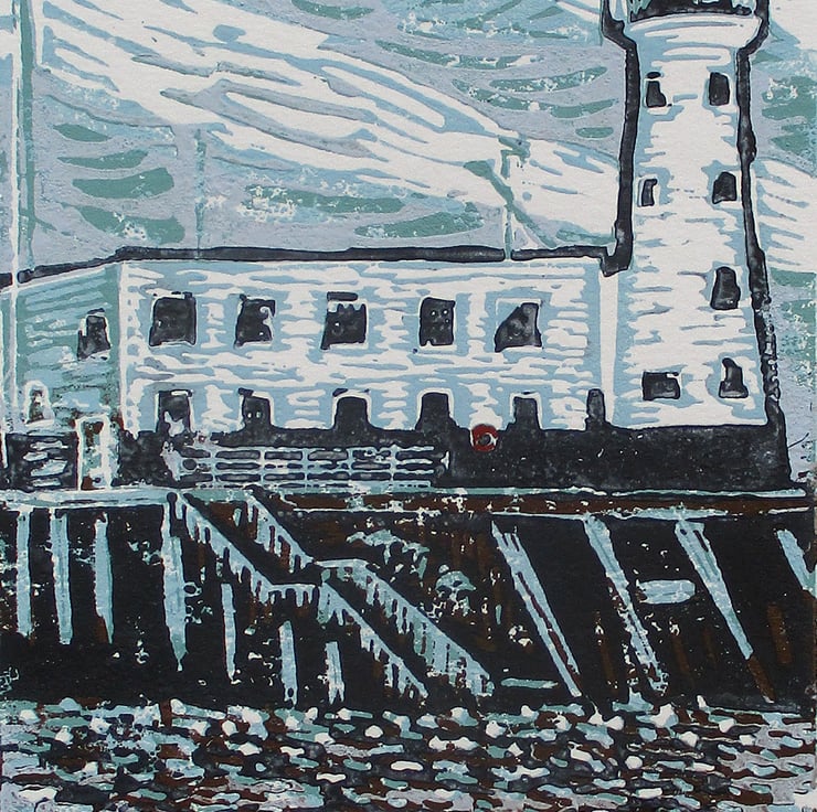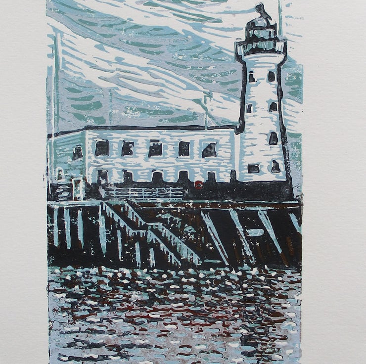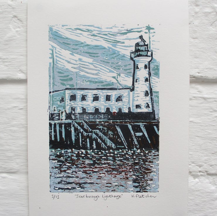 This is an original hand pressed linocut print of Scarborough Lighthouse. It is based on photographs I took while on a short break in Scarborough.