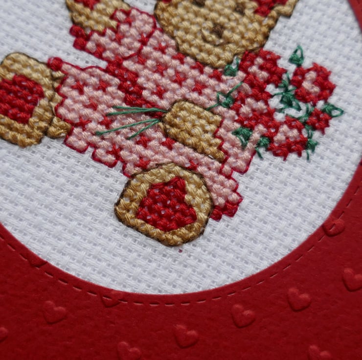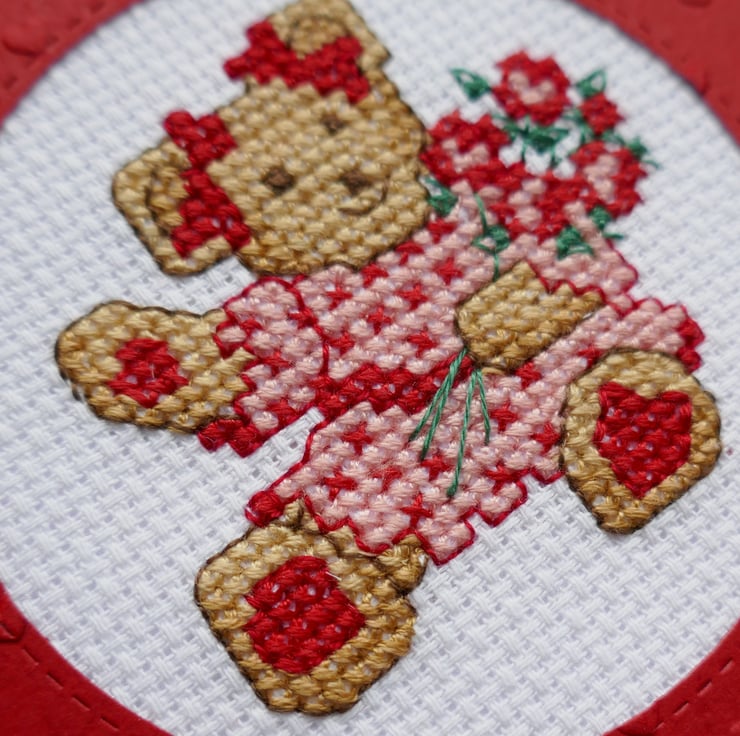 The teddy bear has been stitched on white aida in shades of brown with red heart paws. The teddy is wearing a pink and red dress and has red bows around her ears. She is holding a bunch of red and pink flowers with green leaves and stems. The cross stitch has been mounted behind a red frame with a stitched circle aperture and rounded corners. The frame has been embossed with tiny hearts.