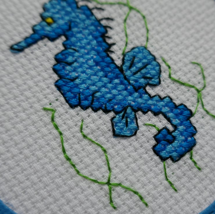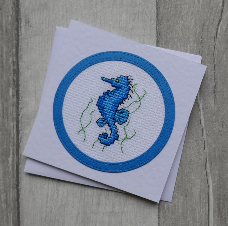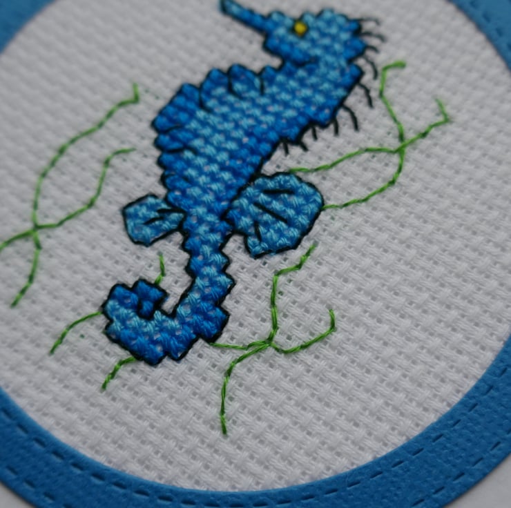 The seahorse is from Mouseloft's 'By the Seaside' collection and has been stitched on white aida in two shades of bright blue. He has a yellow eye and has been outlined in black thread. The cross stitch has been mounted behind a bright blue circle frame that has been cut with two stitched dies.