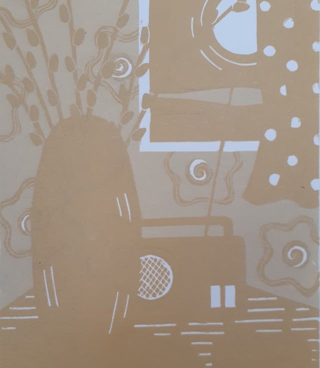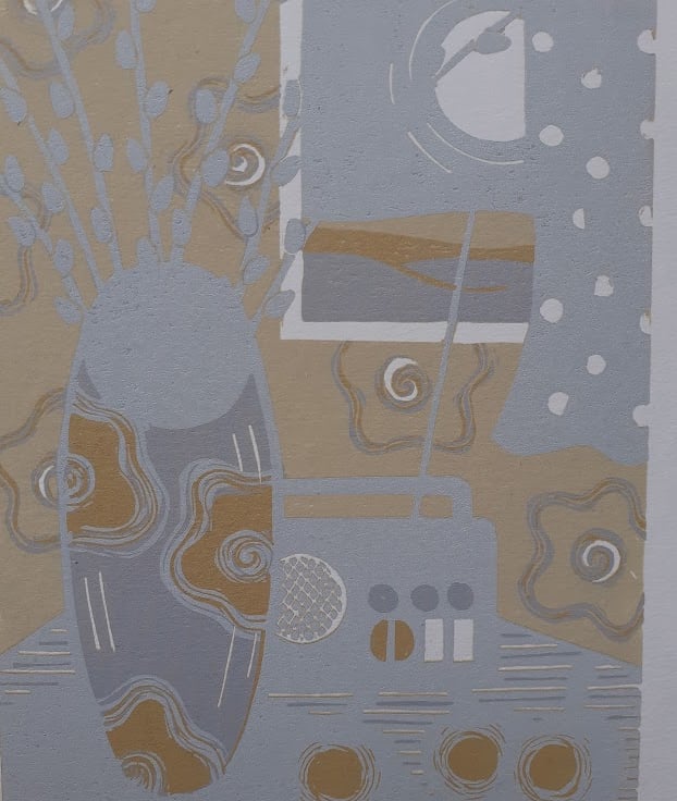 I largely use the reduction method in which the printable area of the lino is gradually cut away as each colour is printed. This is printed in 5 colours.