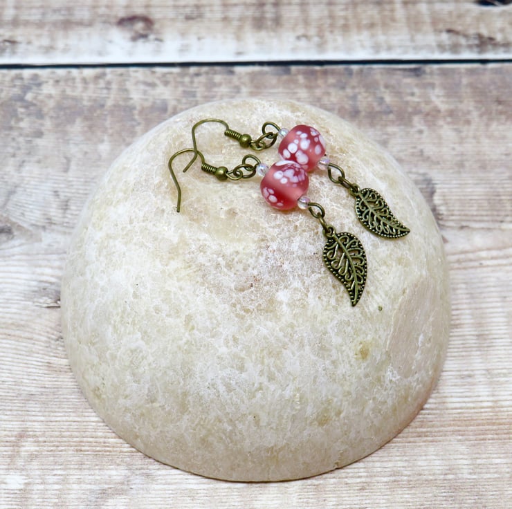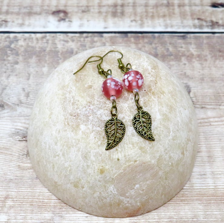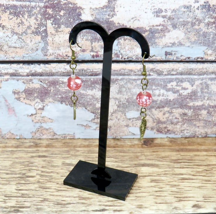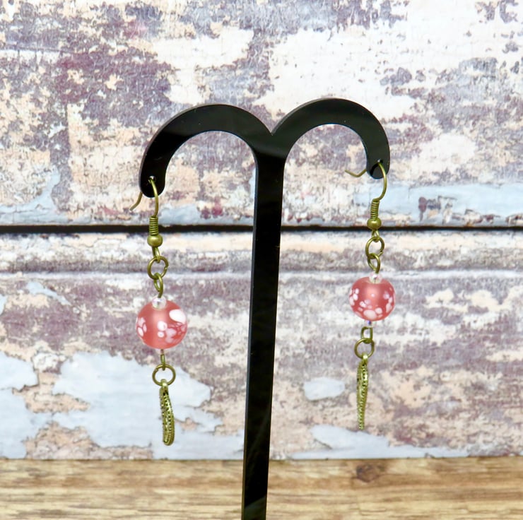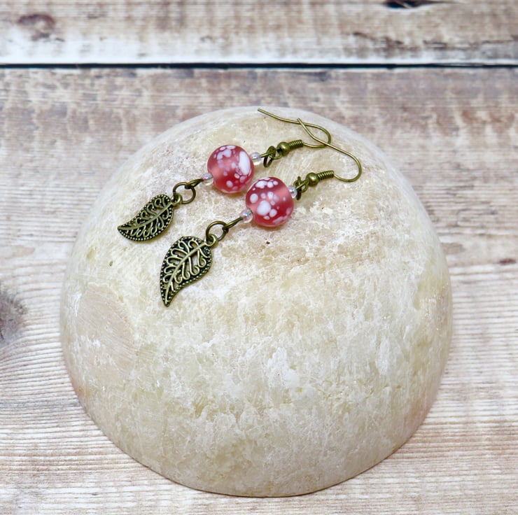 Mottled pink beads, tiny iridescent beads and bronze-plated leaf charms combine to create this pretty pair of earrings. Perfect with an 'up do' the earrings have a drop of 6.5 cm (2 1/2") measured from the top of the ear wires.
