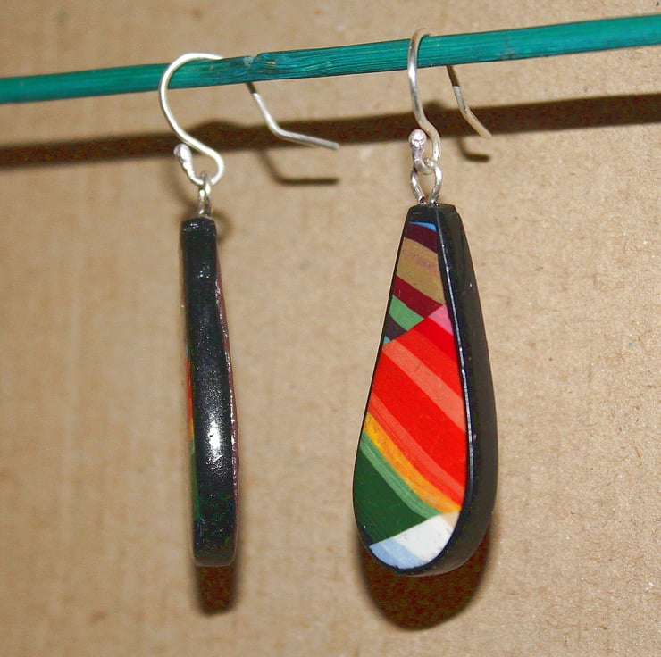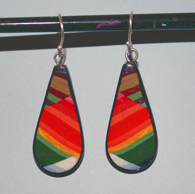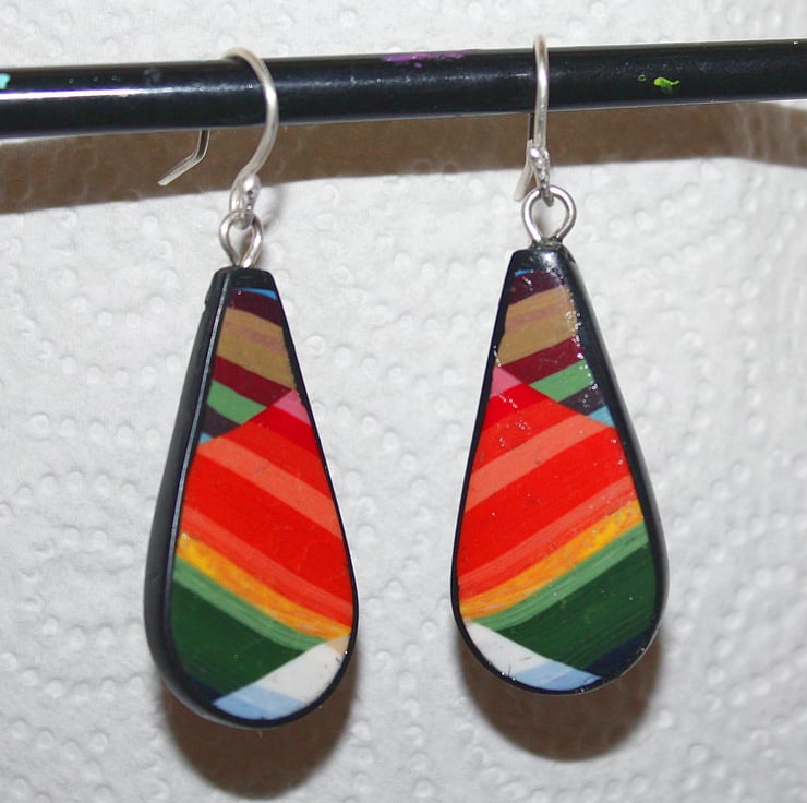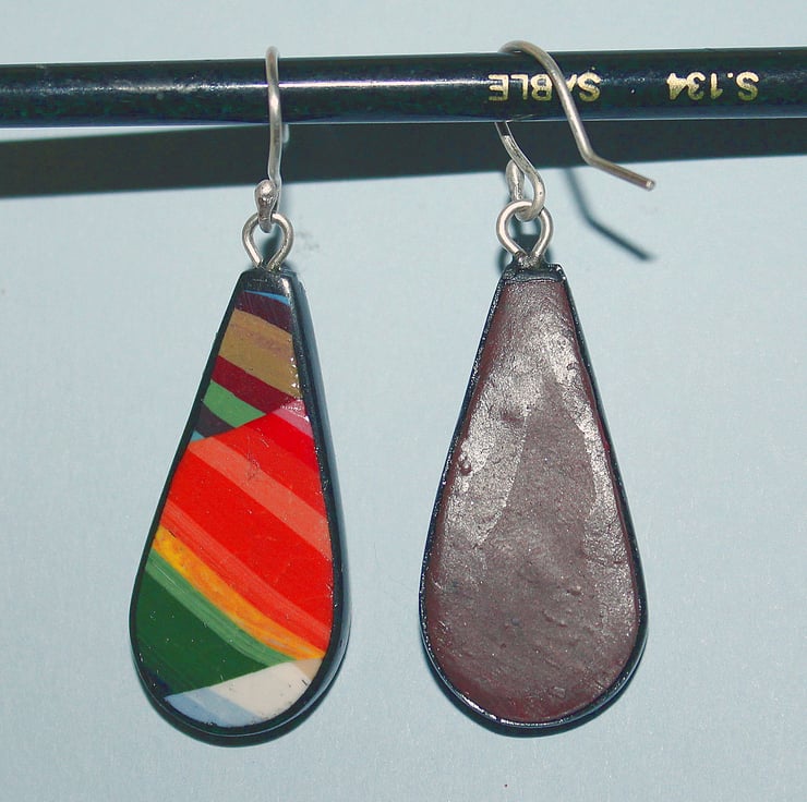 A lively and notable pair of lozenge pendants in sophisticated pattern work hang from sterling silver hooks to give these fancy earrings. They are made by myself from polymer clay. They are light to wear and will keep their rich colours forever.