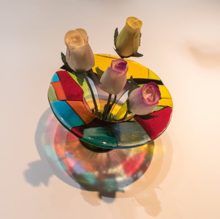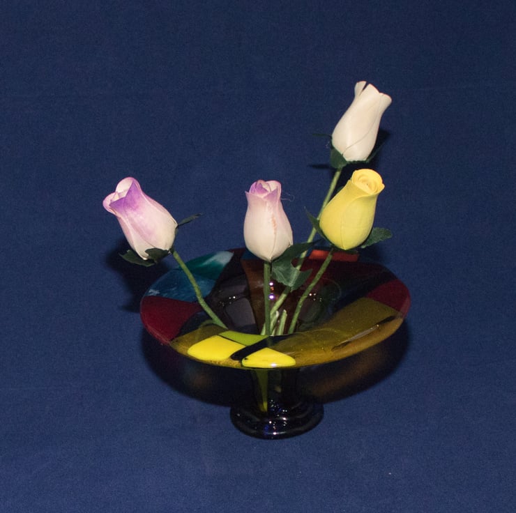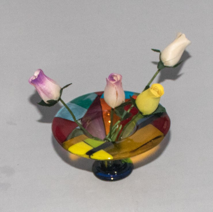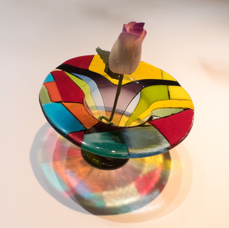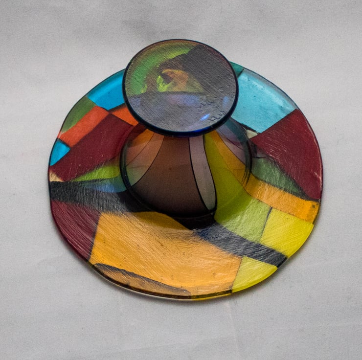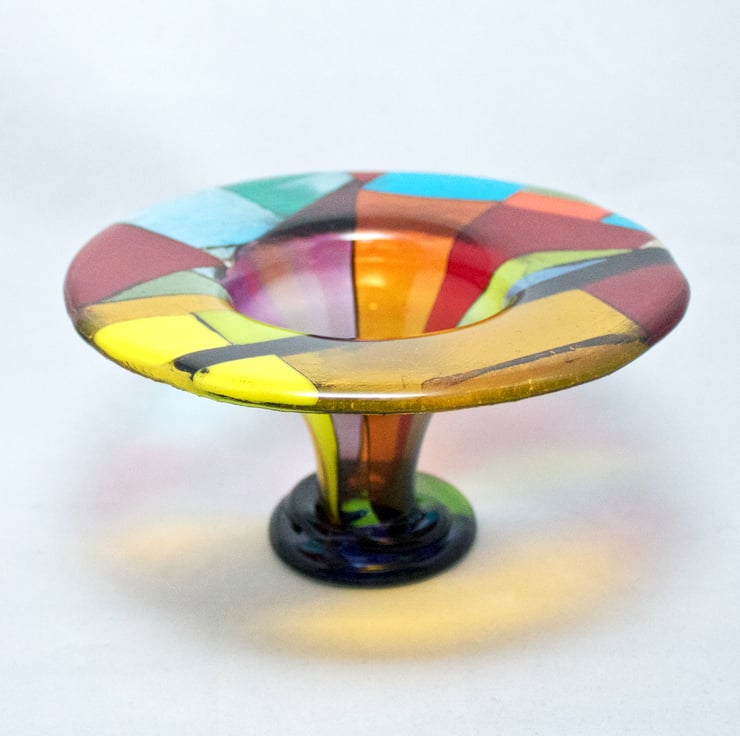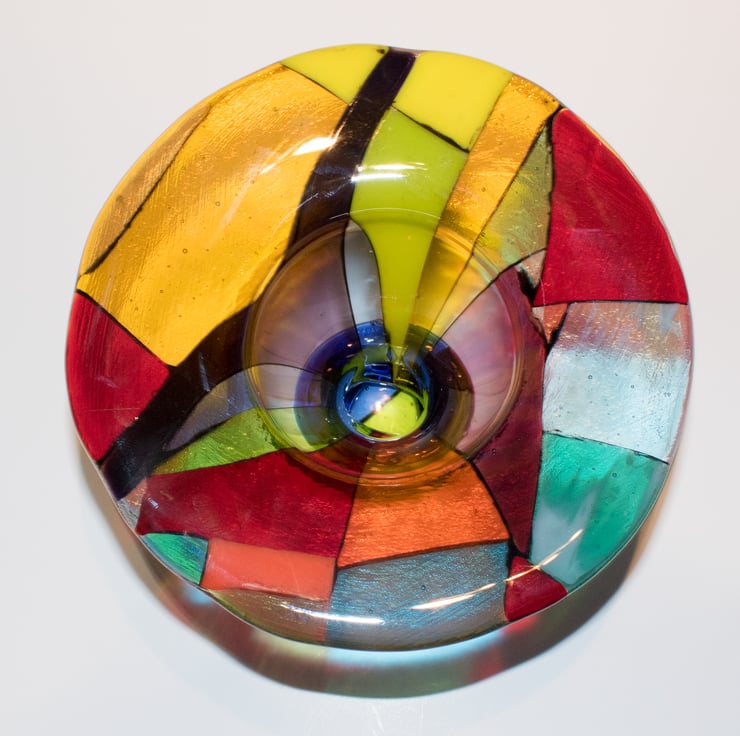 It is made from a hand-cut circle of clear glass on which small pieces of coloured glass have been laid out, jigsaw fashion. The small gaps between the coloured glass pieces have been grouted with black glass powder before a session in the kiln which fuses everything together. A second visit to the kiln with the circle placed on a doughnut-shaped mould which is supported well above the kiln floor allows the glass to flow into this organic shape.