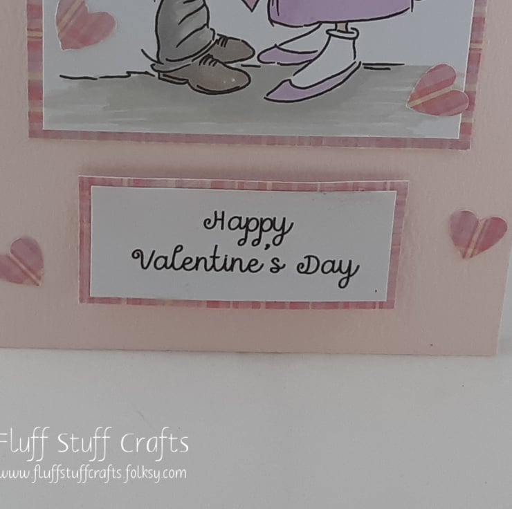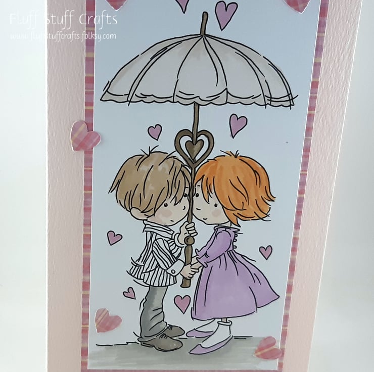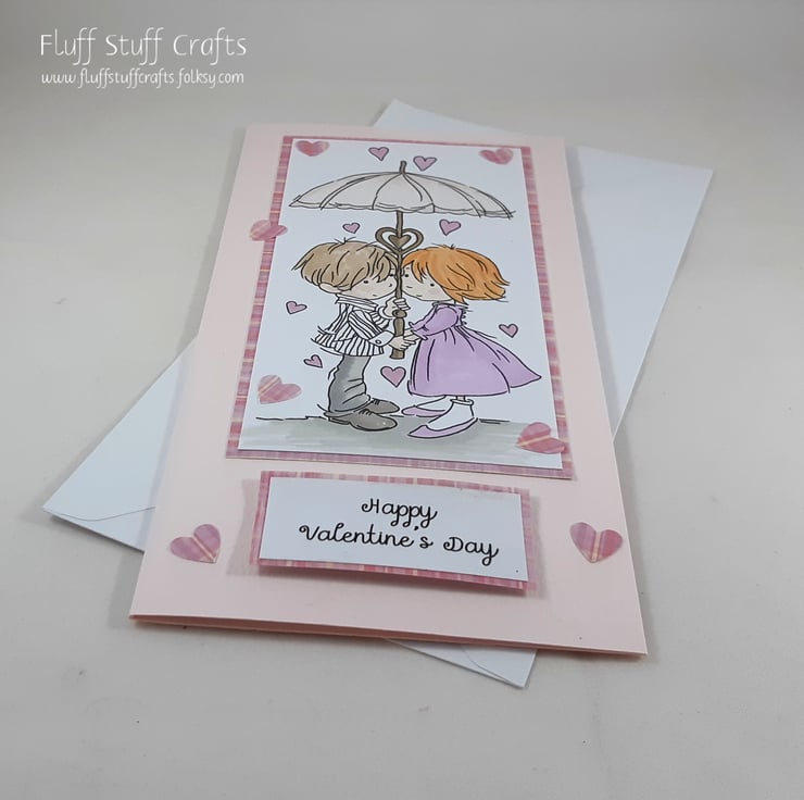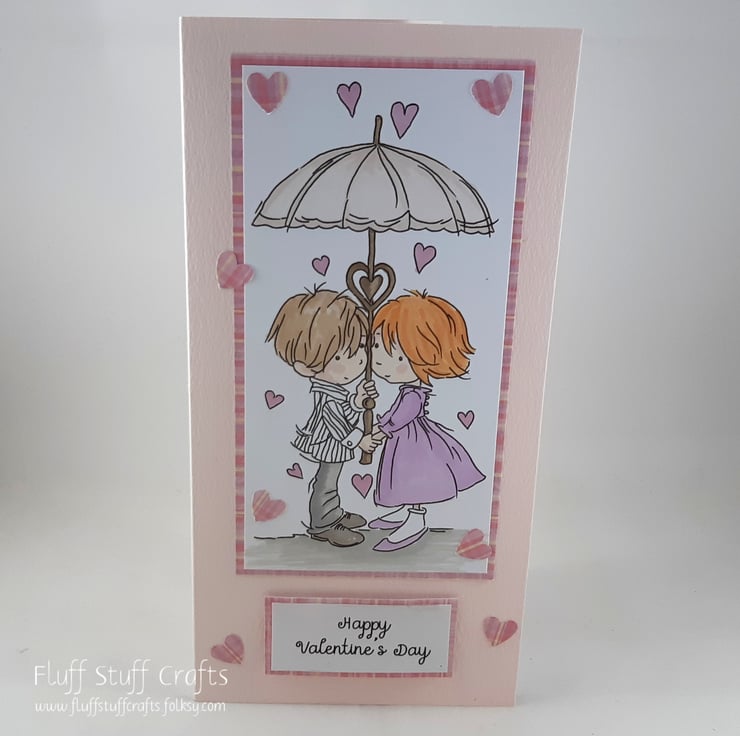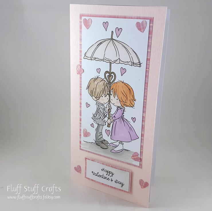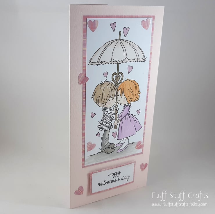 Tall Valentine's Day card featuring a hand coloured image of a couple under a parasol, with hearts raining down on them. The image has been mounted on pink patterned paper over a pale pink card blank. The sentiment reads: 'Happy Valentine's Day'. The insert has been left blank for your own message.