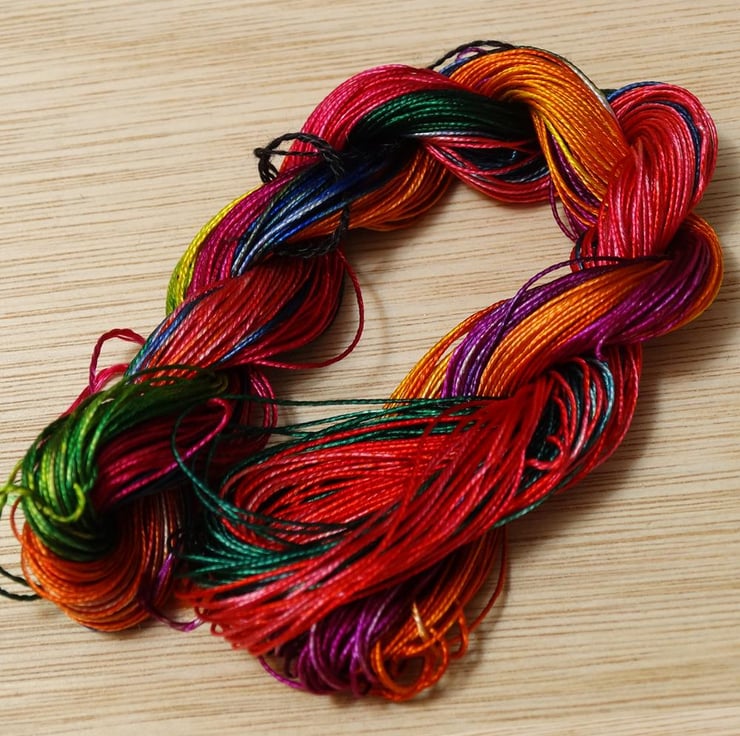 This embroidery thread is made from of 100% Silk and has been handdyed into a rainbow. It is perfect for any form of embroidery including cross-stitch, blackwork and free-hand embroidery. It will be sent already wound onto a bobbin.