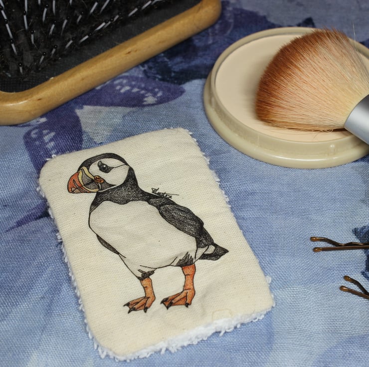 Featuring my very own Atlantic Puffin drawing, this handmade face wipe is backed with high quality terry towellling material which is soft on skin and great for removing make up or applying lotions/moisturisers.